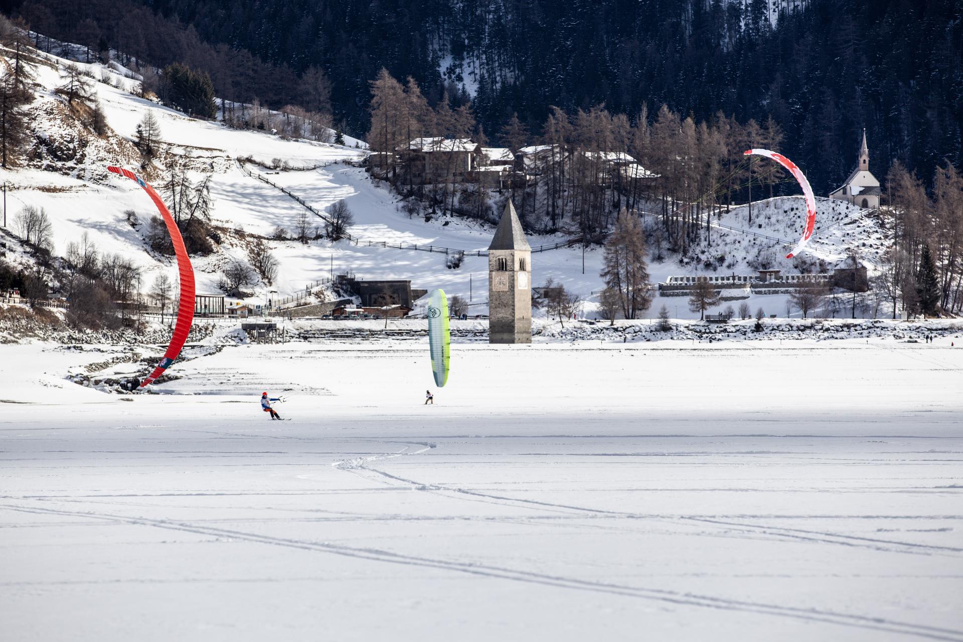 Fly across the frozen lakes Reschensee and Haidersee. Where action meets the feeling of freedom. In the tripoint region, snowkiting is a superlative winter sport. First build up speed on the ice, then let the wind in your kite lift you off the ground. The constant thermals south of the Alpine main ridge make conditions here perfect for snowkiters. No wonder the kite spots in Graun and by the fishing huts at Haidersee lake are distinct favourites by enthusiasts.