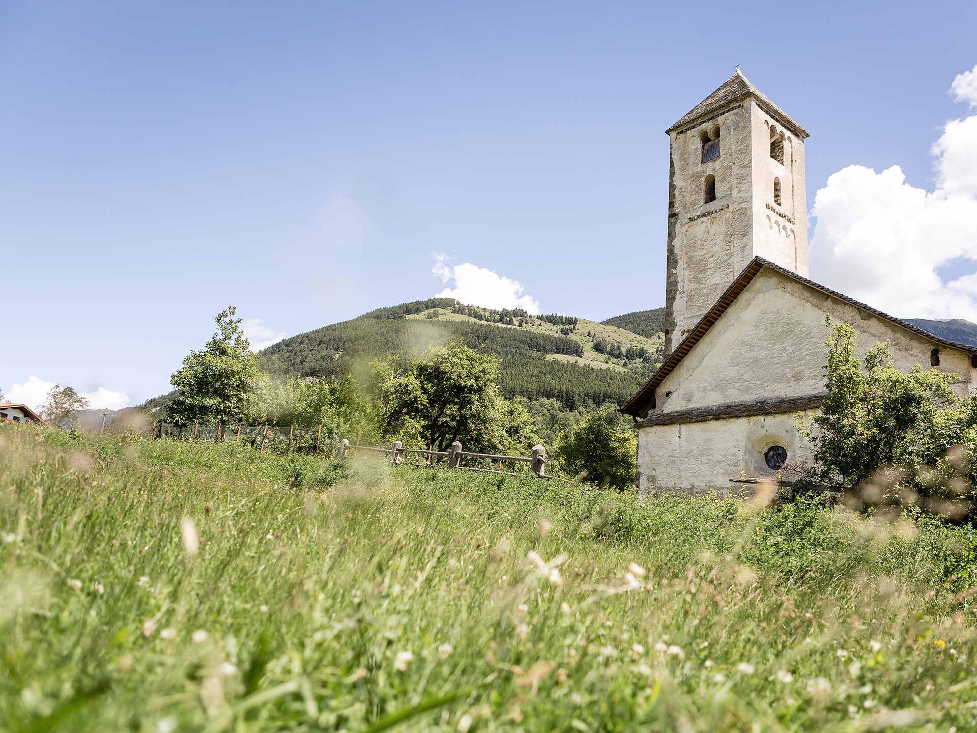 Ein Bau aus dem 8. Jahrhundert. Der romanische Turm stammt aus dem 12. Jahrhundert. Die Malereien und karolingischen Fresken im Inneren zählen zu den ältesten im gesamten deutschen Sprachraum. Die Kirche birgt weltweit das einzige Portrait eines fränkischen Grundherren.