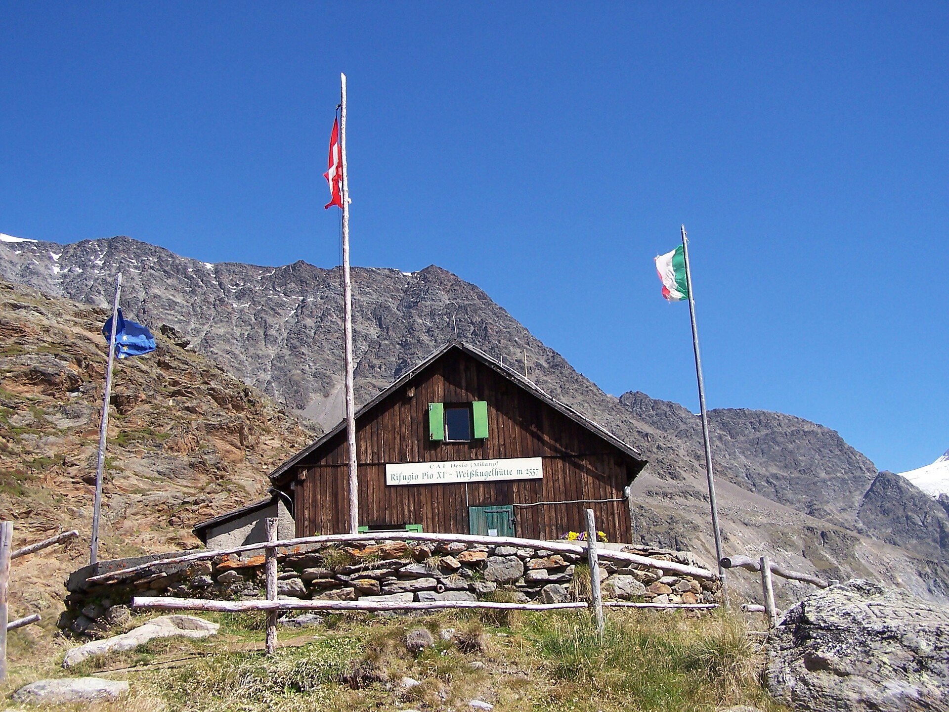 Die Weißkugelhütte liegt in einzigartiger Lage nahe der wild zerklüfteten Gletscherzunge und der höchsten und mächtigsten Gipfel der Südlichen Ötztaler Alpen.