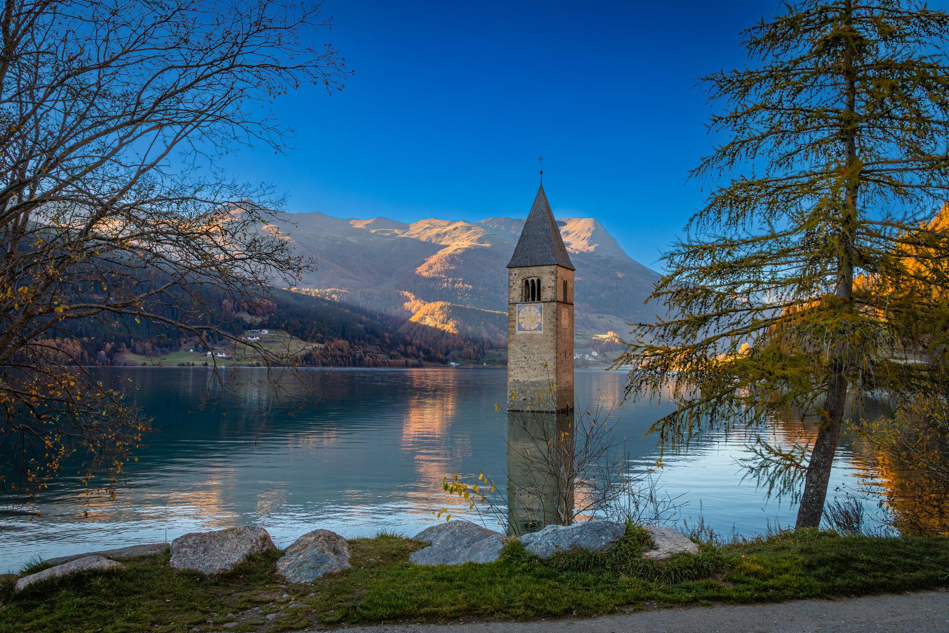 - Der Kirchturm des Dorfes Alt-Graun steht im Reschensee, da das Dorf für den Bau eines Stausees geflutet wurde. Im Jahre 1950 wurden erstmals die Schleusen des neu errichteten Stausees geschlossen und der Wasserspiegel um 22 m angehoben.