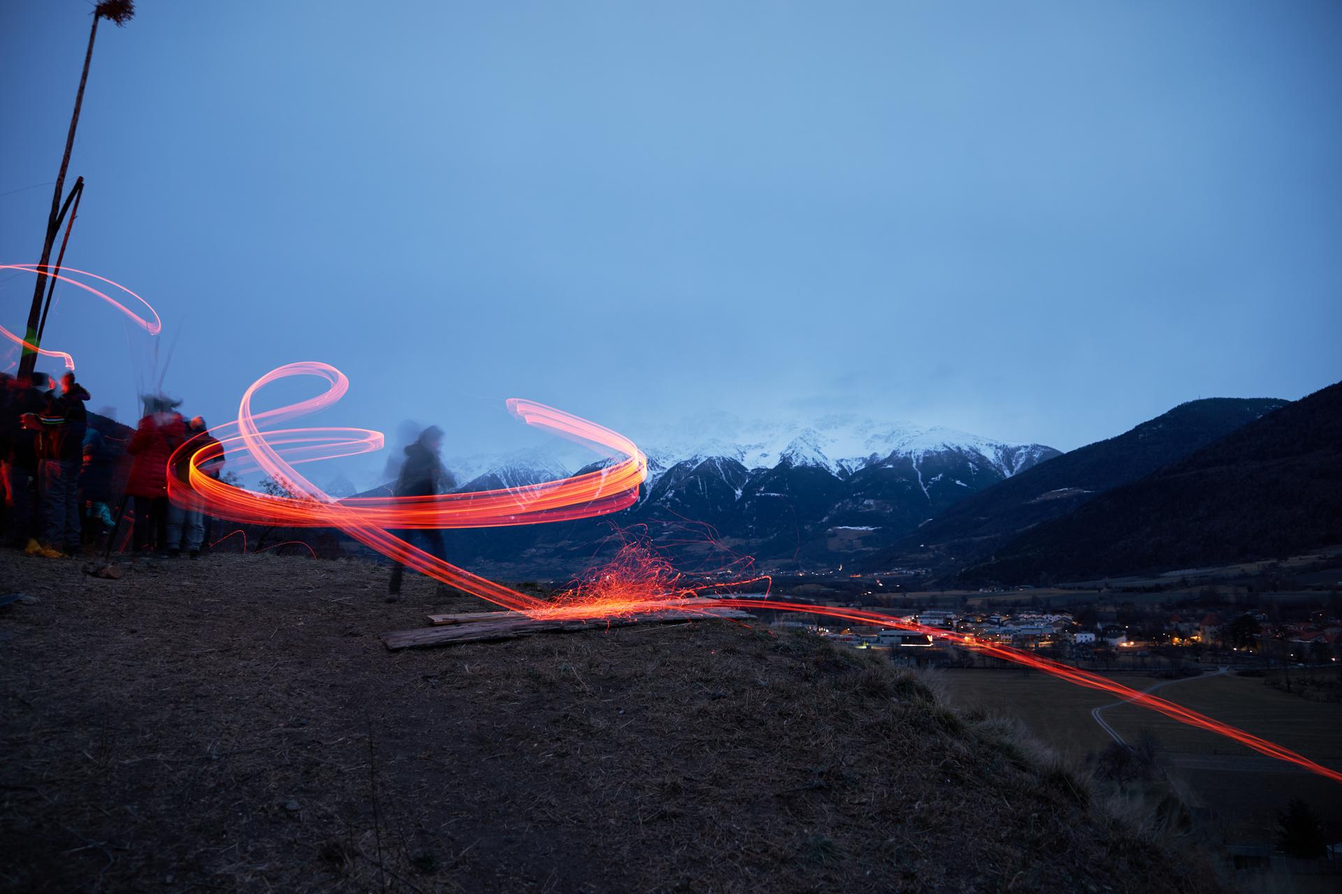 La prima domenica di Quaresima, nella Val Venosta, dischi ardenti di legno di cembro volano verso la valle, portando con sé buoni auspici.