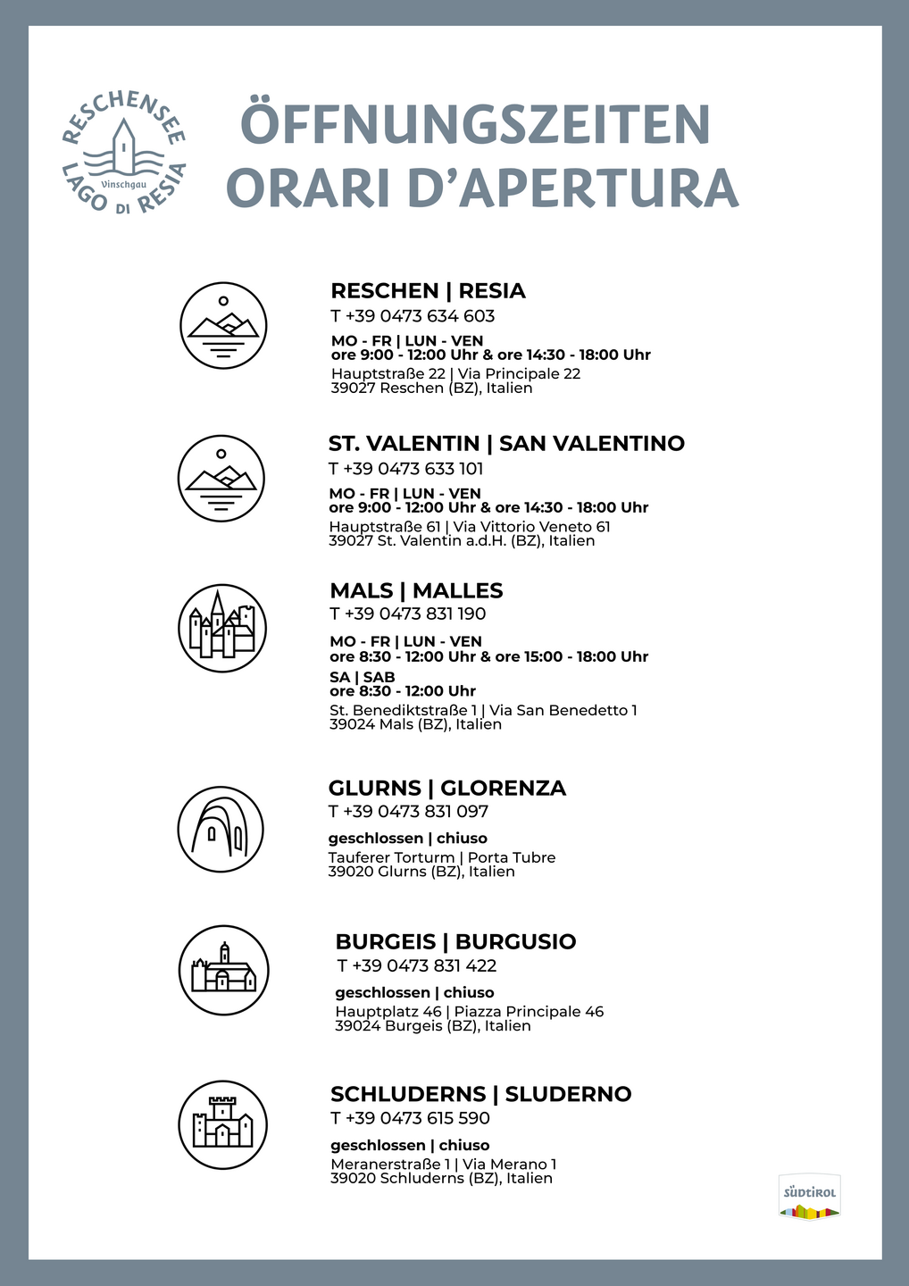 Regione turistica Lago di ResiaVia San Benedetto 1I – 39024 Malles (BZ)Venosta - Alto Adige - Italia