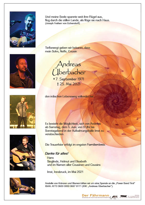 Du hast nichts leicht genommen, dein Lächeln hat manchmal wohl darüber hinweggetäuscht. Du warst ein kritischer und gleichzeitig engagierter Student und Lehrer. Manche Gespräche mit dir sind unvergessen wie deine Musik. Thank you for the music, Andi, und ruhe in Frieden! Mögest du dort, wo du jetzt bist, mit den himmlischen Chören singen und musizieren. Unsere Anteilnahme gilt den Angehörigen.