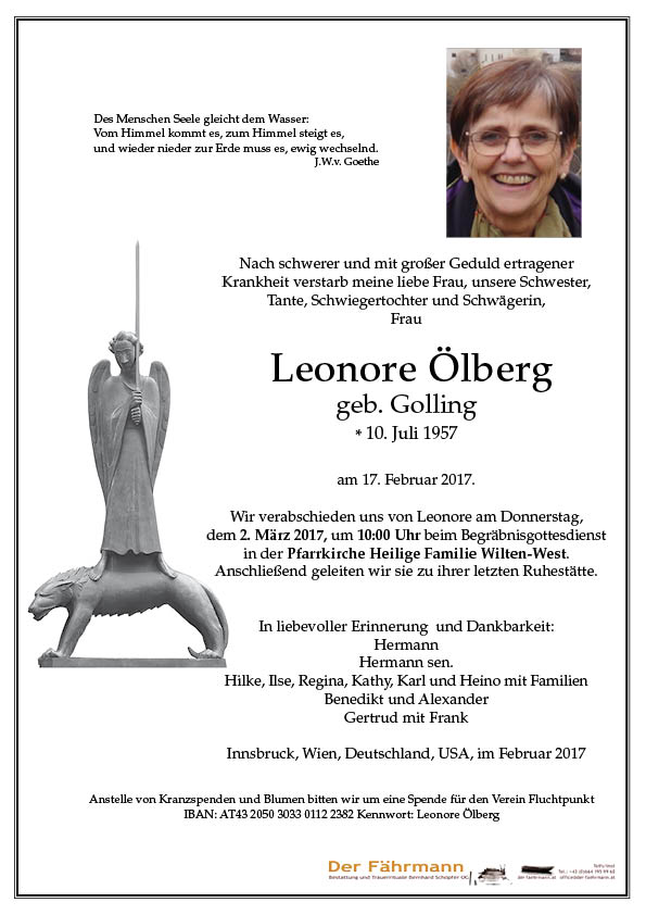 Lieber Hermann, vor dem Hintergrund von Krankheit und Tod verblasst oeffentliches Engagement und wird zweitrangig. Du und Leonore haben in beiden Feldern mehr geopfert, als Menschen zugemutet werden sollte. So nimm auch meinen bescheidenen Dank dafuer entgegen, stellvertretend auch fúer Leonore. Moege sie ihre Ruhe finden und uns in den gemeinsamen Anliegen nun von oben weiter begleiten. Mein herzliches Beileid und beste Wuensche, Bernhard Riepl