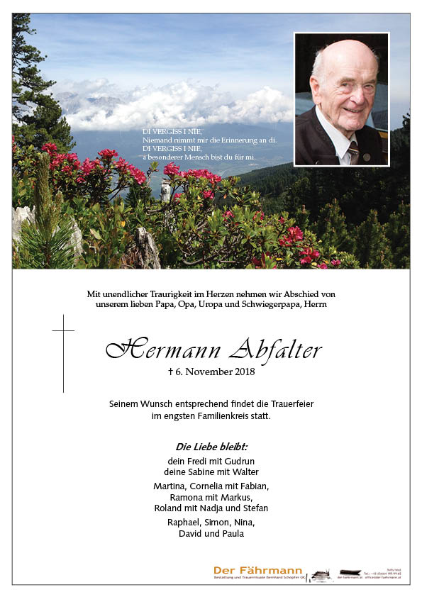 Abfalter Hermann 15.09.1930 06.11.2018 Hall i. T. Beisetzungs-Ort: Haller Friedhof Parte Gedenkkerzen Kondolenzen Parte downloaden Gedenkkerzen für Abfalter Hermann 26 Einträge Kerze anzünden Wir denken ganz fest an dich Wolfgang Köck Ruhe in Frieden Herzliches Beileid! Fam. Wallak Herzliches Beileid! Fam. Wallak Wir wünschen Euch viel Kraft - Christian u. Lisi Rofner Unsere aufrichtige Anteilnahme, Fam. Riegler Hall Arnold und Christine Wackerle Unser tiefes Mitgefühl. Christian, Susanne, Johannes In liebevoller Erinnerung deine Martina Unserer aufrichtige Anteilnahme Fam.Mariani Susanne Wolfgang Köck Aufrichtige Anteilnahme - Christian u. Sibylle Gute Reise OPA ! Stefan, David, Paula Raphael, Ramona, Dennis und Markus PAPA,wir vermissen di ! Sabine und Walter OPA, du fehlst uns!! Cornelia mit Fabian Fam. Barbara und Manfred Tabelander Unser aufrichtiges Beileid! Nina und Florian Die Liebe bleibt Fredi und Gudrun A Liachtl für di OPA. Roli, Nadja, Simon und Nina herzliche Anteilnahme / Fam. Walch ein Licht für euch alle / Fam. Walch Fam. Klaus und Petra Raffelsberger Ruhe in Frieden Aufrichtiges Beileid Joschi und Christl eine gute Überfahrt Bestattung DER FÄHRMANN Eine Kerze für Abfalter Hermann Ihr Name* Ihre Nachricht oder Name* E-Mail-Adresse* Mit dem Klicken auf "Kerze anzünden" erklären Sie sich mit unseren Datenschutzbestimmungen einverstanden. Kondolenzbuch für Abfalter Hermann 0 Einträge Kondolenz verfassen Ihr Abschiedsgruß an Abfalter Hermann Ihr Name* E-Mail-Adresse* Ihre Nachricht* Mit dem Klicken auf "Gruß absenden" erklären Sie sich mit unseren Datenschutzbestimmungen einverstanden. Abfalter Hermann 15.09.1930 – 06.11.2018 Parte Gedenkkerzen Kondolenzen Kerze anzünden Kondolenz verfassen