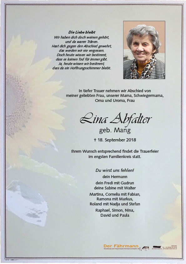 Abfalter Karolina 30.01.1930 18.09.2018 Hall Beisetzungs-Ort: Haller Friedhof Parte Gedenkkerzen Kondolenzen Parte downloaden Gedenkkerzen für Abfalter Karolina 23 Einträge Kerze anzünden Wir denken ganz fest an dich Ruhe in Frieden heidi tonini mit markus In Liebe dein Hermann Christian u. Lisi Rofner Oma, du fehlst uns!! Cornelia mit Fabian Die Liebe bleibt. Familie Angermair Gute Reise Oma ! Stefan mit David und Paula A Lichterl für di Mama Sabine und Walter Christian mit Sibylle Die Liebe bleibt OMA! Deine Martina Angermair Bernhard und Evelyn Unserer aufrichtige Anteilnahme Susanne Mariani mit. Fam. Die Liebe bleibt Fredi und Gudi Oma, a Liachtl für di. Roli, Nadja, Simon und Nina Unser Beileid! Nina und Florian Fam.Marion & Helmut Walch/Stams Ramona, Raphael, Markus, Dennis Aufrichtiges Beileid Christine und Josef Tschabitscher Christian, Susanne und Johannes Fam. Klaus und Petra Raffelsberger Wolfgang Köck eine gute Überfahrt Bestattung DER FÄHRMANN Eine Kerze für Abfalter Karolina Ihr Name* Ihre Nachricht oder Name* E-Mail-Adresse* Mit dem Klicken auf "Kerze anzünden" erklären Sie sich mit unseren Datenschutzbestimmungen einverstanden. Kondolenzbuch für Abfalter Karolina 0 Einträge Kondolenz verfassen Ihr Abschiedsgruß an Abfalter Karolina Ihr Name* E-Mail-Adresse* Ihre Nachricht* Mit dem Klicken auf "Gruß absenden" erklären Sie sich mit unseren Datenschutzbestimmungen einverstanden. Abfalter Karolina 30.01.1930 – 18.09.2018 Parte Gedenkkerzen Kondolenzen Kerze anzünden Kondolenz verfassen