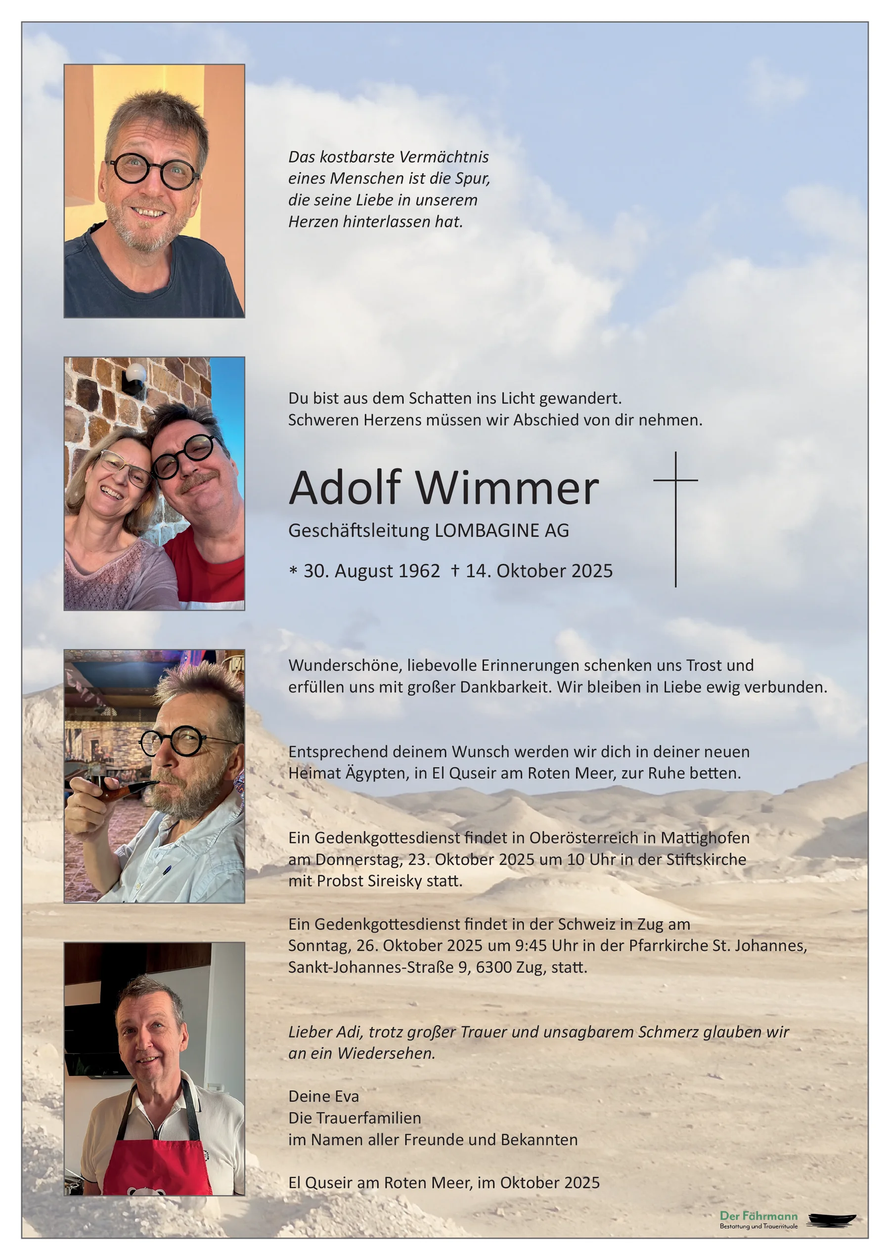 Der Tod von Adi im fernen Ägypten hat mich sehr getroffen; ich teile, liebe Eva, deine Trauer über den Verlust. In seiner Zeit im Seelsorgerat des Kantons Zug hat Adi engagiert mitgewirkt; sein Interesse an religiösen Fragen, sein breites und fundiertes Wissen, sein Einsatz für junge Menschen - all das hat mir sehr imponiert und bleibt mir dankbar in Erinnerung.