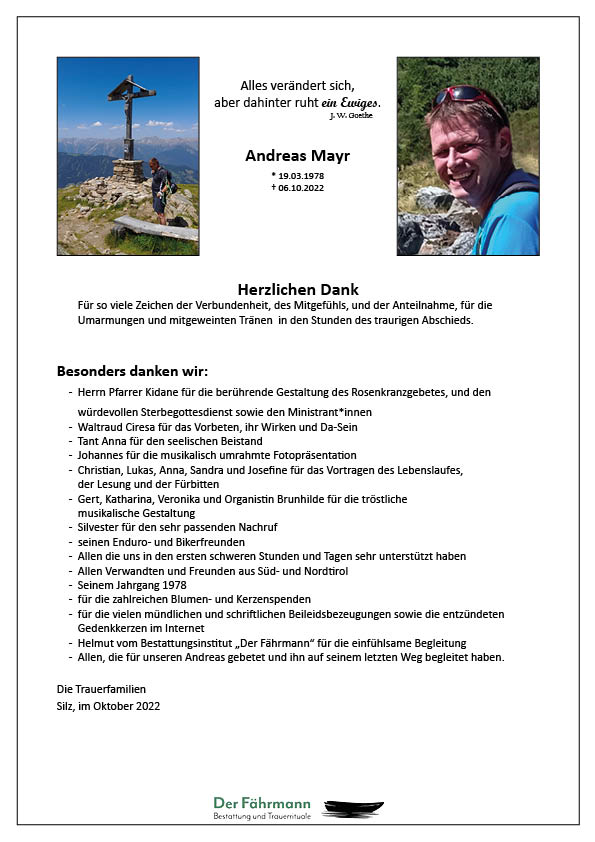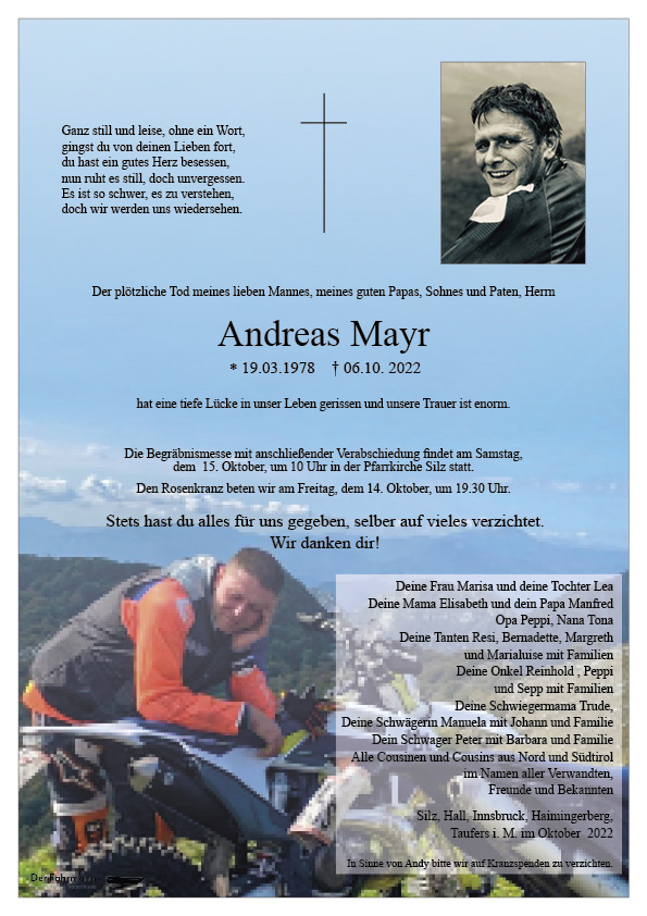 Der plötzliche und unvorhersehbare Tod vom Andi hat uns alle geschockt und bis ins Mark erschüttert. Seine Freundschaft hat uns alle gefreut und besonders mein Leben sehr bereichert mit vielen schönen Erlebnissen , die für schöne Erinnerungen sorgen werden. Wir bedanken uns für seine und eure Freundschaft und werden den Andi immer in unserem Herzen tragen und niemals vergessen .