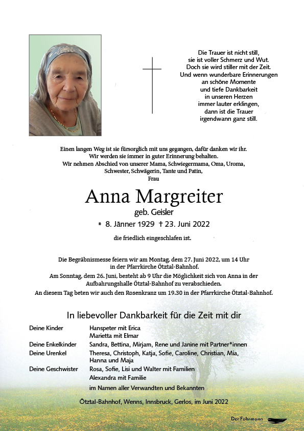 Lieber Hanspeter, liebe Marietta, geschätzte Trauerfamilie. Wir drücken unsere aufrichtige Anteilnahme am Heimgang eurer Mama aus. Frau Margreiter wird uns als freundliche Mitbürgerin in guter Erinnerung bleiben. Möge sie in der neuen Welt mit ihrem Hans die von ihr so geschätzten Berner Rosen-Äpfel genießen können.