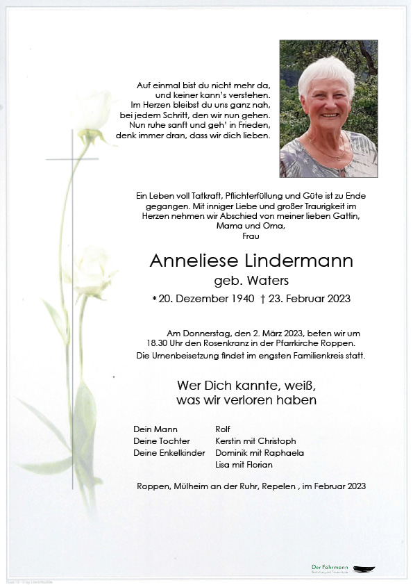 Anneliese durfte ich als fröhliche und lustige Frau kennen lernen und denke gerne daran zurück.