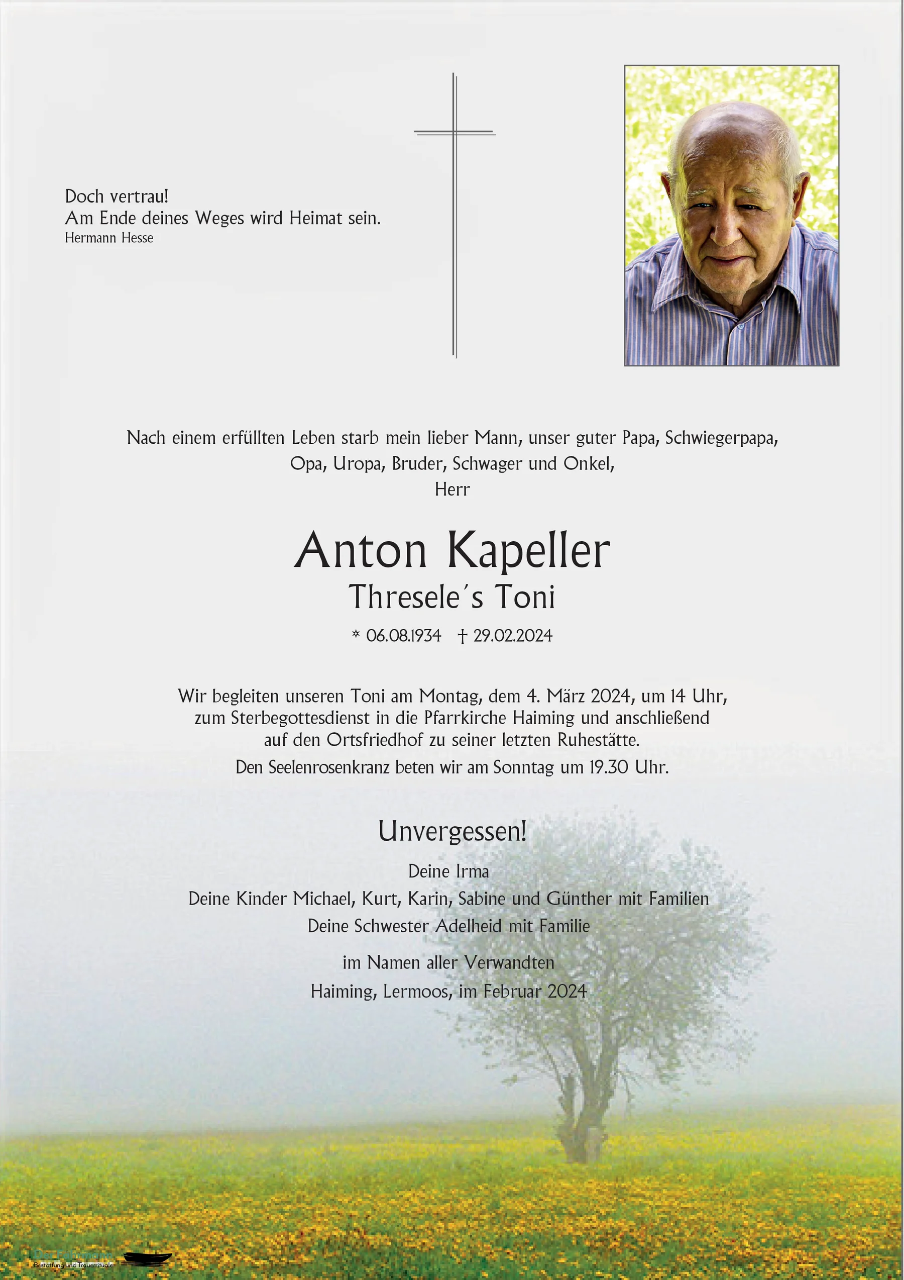 Anton Kapeller 06.08.1934 29.02.2024 Haiming Begräbnismesse mit anschließender Beisetzung, Pfarrkirche Haiming 04.03.2024, 14:00 Uhr Route Beisetzungs-Ort: Friedhof Haiming Aufbahrungs-Ort: Aufbahrungshalle Haiming Rosenkranz, Pfarrkirche Haiming 03.03.2024, 19:30 Uhr Parte Sterbebild Gedenkkerzen Kondolenzen Parte downloaden Sterbebild downloaden Gedenkkerzen für Anton Kapeller 170 Einträge Kerze anzünden Ruhe in Frieden Anton. Kurt Rangger mit Familie Corinna und Christian Kopp Ruhe in Frieden?? Margit Floriani mit Familie Gstrein Sonja Fam. Hannes Kapeller Unser Mitgefühl. Geschwister Gager. Herbert, Renate, Monika, Hubert,Annemarie Ruhe in Frieden?? Margit Floriani mit Familie Fam. Andreas und Sonja Saurwein Ruhe in Frieden In stiller Anteilnahme Fam. Gabriel Kapeller Herzliche Anteilnahme aus Fließ ?Martha und Lois Ruhe in Frieden. Fam. Ladurner Ruhe in Frieden Ruhe in Frieden, Schöpf Cornelia Herzliche Anteilnahme Toni u. ARMELLA In stiller Anteilnahme Fam. Gerd Kapeller Fam Stigger Mario Theresia und Martin Schönherr Silke mit Martin und Paula Herzliches Beileid! Silvio u. Sabine Ruhe in Frieden, Roland & Petra Holzknecht Iris & Toni Hopfgartner Fam. Muglach Edwin Aufrichtige Anteilnahme...Gernot u. Petra Perwög Robert und Rosi A Lichtl aus Lermoos In stiller Anteilnahme- Irene & Alexander Margit und Meinhard Eiter Manuel & Monja mit Liya Familie Glatz Billa Team Haiming Aufrichtige Anteilnahme - Familie Perstaller Aufrichtige Anteilnahme Evi und Stefan Zeni Ruhe in Frieden! Johann und Christl Leitner Plank Hanni und Gitti mit Familie Gerda Hechenberger ( Staggl) In stiller Anteilnahme, Fam. Tina und Martin Spiss Fam. Michael und Manuela Perwög Aufrichtige Anteilnahme Elisabeth und Horst Hannes Stigger m.Fam. Ruhe in Frieden! Peter Fleischmann Mögen Engel dich begleiten..... Aufrichtige Anteilnahme, Hermann, Sandra mit Fam. Aufrichtige Anteilnahme-Stigger Elisabeth Aufrichtige Anteilnahme Sandra Kofler Aufrichtige Anteilnahme Schalk Brigitte In Erinnerung Manfred und Waltraud Aufrichtige Anteilnahme! Herbert und Gerda Kolb Herzliches Beileid. Tanja und Arthur Meßner Strasser Rudolf Sautens Ruhe in Frieden! Beate und Thomas Flunger Aufrichtige Anteilnahme von Fam. Aicher Max mit Maria A Liachtl für Dein Papa. Hannes und Maria-Luise Ruhe in Frieden, Fam Susac In liebem Gedenken Greta mit Andrea und Daniel Fam. Silvia & Oskar Falkner Aufrichtige Teilnahme entbietet Manuela mit Familie ? Iris & Toni Hopfgartner Ruhe in Frieden Christa & Peter Herzliche Anteilnahme von Herta Moll-Schwetz ? Herzliche Anteilnahme Rosina & Peter Strigl Martina und Christian Walter Löffler In stiller Anteilnahme Gerlinde und Peter Schuler Kolednik Hermann u.Simone.Ruhe in Frieden ❤ Herzliches Beileid! Sissy und Günter Fam. Hanni und Siegfried Stigger Aufrichtige Anteilnahme - Jolanda und Helmut Ruhe in Frieden ?️Melanie und Manuel mit fam. Familie Kleewein Rene u. Tamara Ruhe in Frieden! Armin & Patricia Kopp In stiller Anteilnahme Fam. Gabi & Thomas Costa Ruhe in Frieden Hermann und Trude Ruhe in Frieden?Josef und Bettina Herzliche Anteilnahme Alexandra und Herbert Spielmann Herzliches Beileid! Annemarie Hasel Ruhe in Frieden - Fam. Brugger Helga Aufrichtige Anteilnahme Elli Nagele Aufrichtige Anteilnahme! Ursula und Karl Kopp Meinhard und Marianne Floriani R.I.P. Carmen, Julian, Gabriel u. Tobias Kapeller Fam. Auf der Klamm Gerhard und Petra Herzliches Beileid - Andrea u. Wolfgang Stigger Aufrichtige Anteilnahme - Stigger Irmgard Aufrichtige Anteilnahme ! Christine & Geri Aufrichtige Anteilnahme Elmar und. Marlene mit Familie Ruhe in Frieden Toni ! Herbert Pohl Alfred Neurauter Aufrichtige Anteilnahme, Catrin u. Markus Raffl Aufrichtige Anteilnahme! Ruth Guggenberger mit Familie Unsere Anteilnahme, Bianca & Tino mit Valerio R.I.P Werner und Renate Raffl R.I.P Werner und Renate Raffl In lieber Erinnerung-Anneliese Roppen Astrid,Stefan und Marcel Aufrichtige Anteilnahme Fam Elmar Gruber Ruhe in Frieden ! Rita u. Hubert Stigger Aufrichtige Anteilnahme! Patricia mit Rene Fam. Manfred Wegleiter In stiller Anteilnahme. Jessica & David In lieber Erinnerung, Andreas und Martina Raffl Team Gutmann Ötztaler Höhe Helga Hanin Christl Gebhart In lieber Erinnerung! Bruno u. Friederike Herzliches Beileid! Melanie & Gottfried mit Familie Ruhe in Frieden Silvia u. Edi Aufrichtiges Anteilnahme Hermann Stotter mit Mitarbeiter:innen NPHT In lieber Erinnerung, Sonja und Günther Aufrichtige Anteilnahme Hansjörg und Regina Herzliches Beileid ! Herlinde und Manfred Thurner Herzliches Beileid von Claudia, Mario, Luca und Letizia Unser herzlichstes Mitgefühl. Karin u. Peter Haselwanter Aufrichtige Anteilnahme Rudolf u. Angelika Stigger Ruhe in Frieden.Bernd, Sautens Ruhe in Frieden! Anita und Harald Lugsteiner Unser herzliches Beileid der ganzen Familie! Marion u.Wilfried Aufrichtige Anteilnahme Petra u. Josef Hofmann Herzliches Beileid. Tici und Thomas Irmgard und Edgar Ruhe in Frieden lieber Toni. Gadner Helmuth In lieber Erinnerung! Marion u. Wilfried Herzliche Anteilnahme! Petra u. Herbert Reinstadler Fam. Thomas und Christine Hairer Herzliche Anteilnahme Carmen & Günther mit Paula In Lieber Erinnerung Marlies Lercher Herzliches Beileid! Gabi u. Walter Pfausler Herzliche Anteilnahme - Dorothea und Paul In stiller Anteilnahme Simone und Matthias Riml Aufrichtiges Beileid! Angelika und Werner Köll Ruhe in Frieden Herzliche Anteilnahme Anita Zumtobel Mein auffrichtiges Beileid! Doris Gürtler Ruhe in Frieden Fam. Albrecht Götsch Fam.Margot und Andreas Hell In lieber Erinnerung Robert & Lisi In stiller Anteilnahme Rudi u. Marlene Neurauter Ruhe in Frieden Richard Larcher Herzliche Anteilnahme, Hansjörg & Gabi Mein herzliches Beileid Juliane Auer Aufrichtiges Beileid! Elisabeth Kreuzer Aufrichtige Anteilnahme Dora und Oskar Pohl Aufrichtige Anteilnahme. Angelika und Helmut Stigger In lieber Erinnerung Wendl und Helene Silz Ruhe in Frieden Fam. Kassegger Hartmut und Edith In lieber Erinnerung Bernhard u