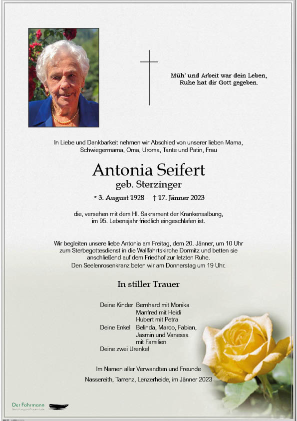 " Die Mama war' s " diese Worte beinhalten so viel, vor allem in dieser Zeit des Abschied's , aber dir Manfred und Heidi auch euren Kindern bleibt die Erinnerung an die Zeit die ihr mit Antonia in eurer Mitte verbringen konntet an die Familienfeiern bei denen Antonia noch vergangenes Jahr mit dabei war-an die Besuche bei ihr im Heim - sie war sehr stolz auf ihren fleißigen Bua u.seine Familie , was sie noch vor wenigen Wochen so emotional erzählte- möge die Gewissheit diese Zeit der Gemeinsamkeit genutzt zu haben euch Trost und Kraft schenken jetzt und in Zukunft- wir sind mit Gedanken und Herzen bei Euch - Antonia jetzt bist du wieder an der Seite von deinem Rudolf R.I.P.