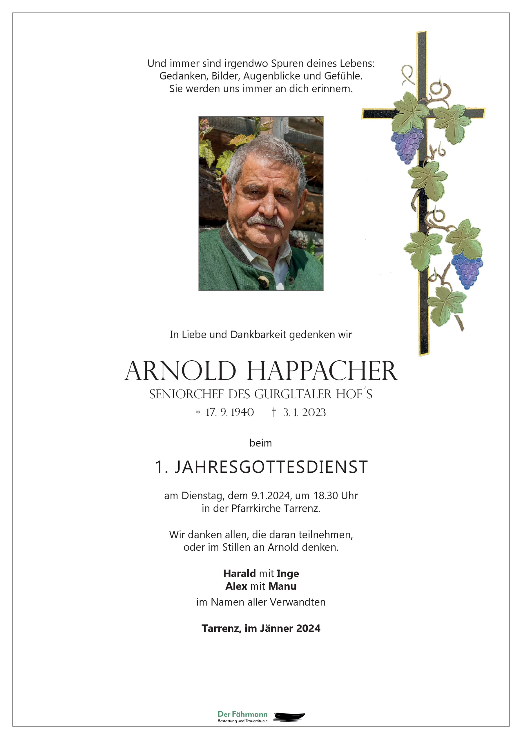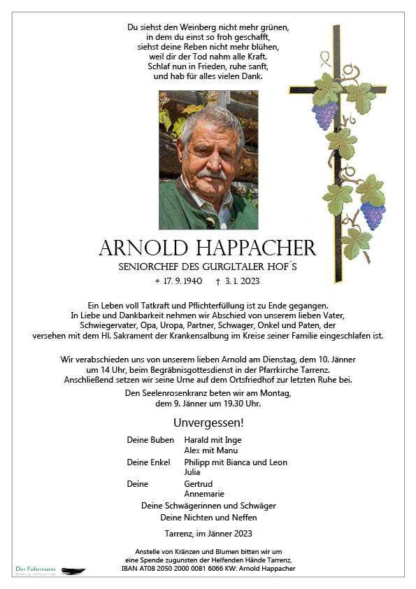 Arnold hat euch nun für immer verlassen. Er war jemand, der immer zukunftsorientiert, vorausschauend gedacht und gearbeitet hat. Dadurch hat er viel zur Entwicklung von Tarrenz beigetragen. Er wir vielen noch lange, vor allem als freundlicher und aufmerksamer Gastwirt in Erinnerung bleiben.