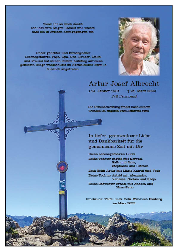 Artur Albrecht 14.01.1931 21.03.2022 Innsbruck Beisetzungs-Ort: Innsbruck Wilten Westfriedhof Parte Gedenkkerzen Kondolenzen Parte downloaden Gedenkkerzen für Artur Albrecht 9 Einträge Kerze anzünden Sepide A Liachtl aus Telfs In ewiger Liebe bis zu deinem letzten Atemzug, deine Rikki Im Herzen unvergessen Deine Tochter Astrid mit Familie ❤️ Ewig in unseren Gedanken.Deine Enkeln Nadine, Katja, Vanessa Fuer ewig in unseren Herzen. Sara, Falk und Kerstin In ewiger Verbundenheit und Liebe, Deine Tochter Ingrid möge das Licht Dir Deinen Weg erleuchten. Dein Sohn Artur Eine gute Überfahrt Bestattung DER FÄHRMANN Eine Kerze für Artur Albrecht Ihr Name* Ihre Nachricht oder Name* E-Mail-Adresse* Mit dem Klicken auf "Kerze anzünden" erklären Sie sich mit unseren Datenschutzbestimmungen einverstanden. Kondolenzbuch für Artur Albrecht 0 Einträge Kondolenz verfassen Ihr Abschiedsgruß an Artur Albrecht Ihr Name* E-Mail-Adresse* Ihre Nachricht* Mit dem Klicken auf "Gruß absenden" erklären Sie sich mit unseren Datenschutzbestimmungen einverstanden. Artur Albrecht 14.01.1931 – 21.03.2022 Parte Gedenkkerzen Kondolenzen Kerze anzünden Kondolenz verfassen