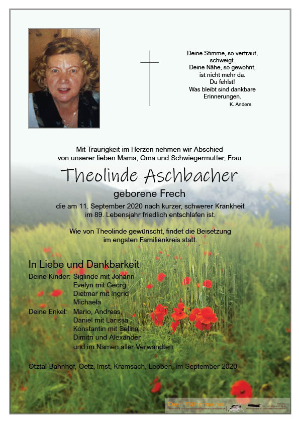 Wir wünschen euch viele schöne Erinnerungen und Gedanken an eure Mutter. Viel Kraft und Trost in den Tagen der Trauer.