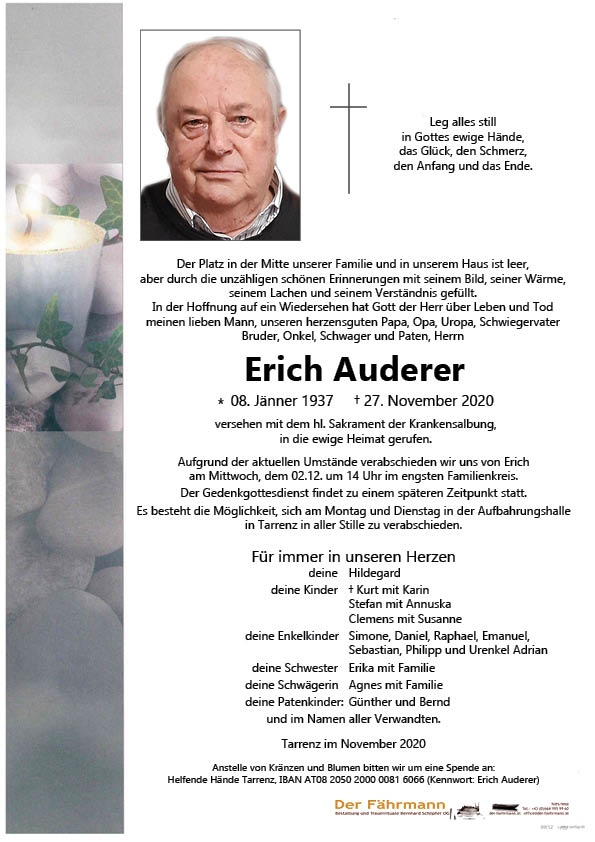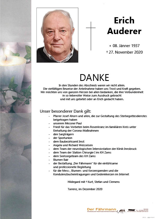Mit Traurigkeit im Herzen heißt es nun Abschied nehmen von Erich. Viele in Tarrenz und auch weit über die Grenzen des Bezirkes hinaus haben Erich ob seiner Hilfsbereitschaft; Kameradschaft, als Arbeitskollegen und nicht zuletzt als geselligen Sportkameraden geschätzt.