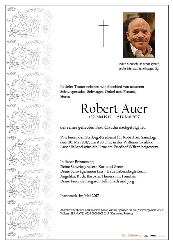 Auer Robert 12.05.1949 13.05.2017 Innsbruck Beisetzungs-Ort: Friedhof Wilten Parte Gedenkkerzen Kondolenzen Parte downloaden Gedenkkerzen für Auer Robert 16 Einträge Kerze anzünden fzfcqiihfi zodawzqahg qceklhzkcx vxyboauowr bgrcfralvy Wolfgang Köck Ein Lichtgruß in die E w i g k e i t für Dich *HERTA* Ein Lichtgruß für Dich + Claudia in lieber Ernnerung *HERTA* In lieber Erinnerung an Dich + Deine liebe Claudia *HERTA* Ruhe in Frieden In lieber Erinnerung *HERTA SCHAPLER-GEIGER* Juen Gertrud Das ewige Licht leuchte ihm! R.I.P.! Ein Engel an deine Seite hans jäger telfs eine gute Überfahrt – Bestattung DER FÄHRMANN Eine Kerze für Auer Robert Ihr Name* Ihre Nachricht oder Name* E-Mail-Adresse* Mit dem Klicken auf "Kerze anzünden" erklären Sie sich mit unseren Datenschutzbestimmungen einverstanden. Kondolenzbuch für Auer Robert 0 Einträge Kondolenz verfassen Ihr Abschiedsgruß an Auer Robert Ihr Name* E-Mail-Adresse* Ihre Nachricht* Mit dem Klicken auf "Gruß absenden" erklären Sie sich mit unseren Datenschutzbestimmungen einverstanden. Auer Robert 12.05.1949 – 13.05.2017 Parte Gedenkkerzen Kondolenzen Kerze anzünden Kondolenz verfassen