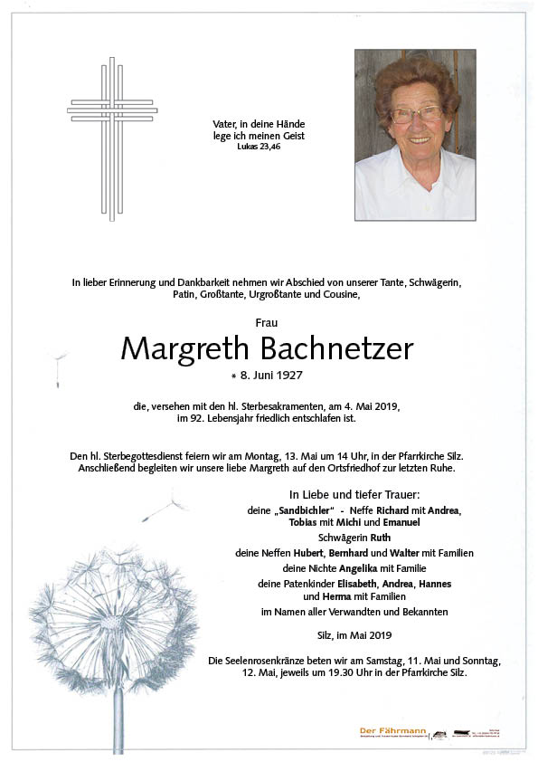 Bachnetzer Margreth 08.06.1927 04.05.2019 Silz Beisetzungs-Ort: Friedhof Silz Aufbahrungs-Ort: ab Sa, 11. Mai in der Aufbahrungshalle Silz Parte Gedenkkerzen Kondolenzen Parte downloaden Gedenkkerzen für Bachnetzer Margreth 85 Einträge Kerze anzünden Ruhe in Frieden Zum 1. Jahrtag Wolfgang Köck In lieber Erinnerung! Ruhe in Friden! In lieber Erinnerung! Ein Licht für dich Christine u. Werner Mair Matrei Claudia und Hans Stolz, Ranggen Christian Perwög Fam. Robert Ciresa Siegfried und Hanni Stigger In stillem Gedenken Maria Pohl Johann und Herta Zauner Ein Licht für Dich Grrtel Fleischmann Langenfeld Monika u.Gerhard Platzgummer Telfs Alfred u.Martha Ruhe in Frieden Gerda Muglach R.I.P Fam.Schimanz / Sautens Ein Licht aus Stams Monika und Max HEINZ Aufrichtige Anteilnahme Wolfgang und Irmgard Fam. Johann u. Anita Föger Fam. Hildegard&Rudi Ostermann Oliver Wille Stefanie & Bernhard & Martin & Johanna Rene und Sabrina Rauch(Hirn) Gitti mit Familie Fam. Manfred Wegleiter Leitner Friede Stigger Elisabeth mit Familie Leitner Friede Barbara und Josef Bachnetzer Barbara und Josef Bachnetzer Tobias & Michi Caroline mit Maria Heidi und Meinrad jun. In lieber Erinnerung Ulli und Martin Christina&Daniel Franz Josef Perwög Christine Dablander, Telfs Carina & Fred mit Jonas Ciresa Siegfried & Renate Elke Santer-Rettenbacher Manuela Jordan ( Ciresa ) Leiter Martin Ruhe in Frieden. Gudrun und Martin Mayr-Bergant In lieber Erinnerung! Sigrid Gritsch Ruhe in Frieden! Margreth Strasser Nadja und Robert Reindl Silvia und Richard Wille Schöpf Manuela und Gerhard Fam. Mareiler Bruno Omas Blumenladen Omas Blumenladen Tanja, Martin und Lorena Verena u. Martin Hanni und walter Wolfgang Köck Andreas und Elisabeth Gstrein Roppen Alexandra Tini Wille Matthias und Miriam Silvia und Raphael Floriani Marina und Hermann Floriani sabine und andreas Hubert u. Monika Carina & Fred mit Jonas R.I.P Werner &Sabine Erhart Emanuel Carina & Fred mit Jonas Carina & Fred mit Jonas Emma und Anton Kluibenschädl Günter und Eva Neurauter A Liachtl von Maria-Luise und Hannes Andrea u.Richard Helmut und Sabine Zoller Aufrichtiges Beileid Fam.Leiter Ruhe in Frieden. Jung Paula R.I.P Marion Walch mit Familie/Stams Carina Walser Adi u. Melitta Walser Adi u. Melitta Walser eine gute Überfahrt Bestattung DER FÄHRMANN Eine Kerze für Bachnetzer Margreth Ihr Name* Ihre Nachricht oder Name* E-Mail-Adresse* Mit dem Klicken auf "Kerze anzünden" erklären Sie sich mit unseren Datenschutzbestimmungen einverstanden. Kondolenzbuch für Bachnetzer Margreth 0 Einträge Kondolenz verfassen Ihr Abschiedsgruß an Bachnetzer Margreth Ihr Name* E-Mail-Adresse* Ihre Nachricht* Mit dem Klicken auf "Gruß absenden" erklären Sie sich mit unseren Datenschutzbestimmungen einverstanden. Bachnetzer Margreth 08.06.1927 – 04.05.2019 Parte Gedenkkerzen Kondolenzen Kerze anzünden Kondolenz verfassen