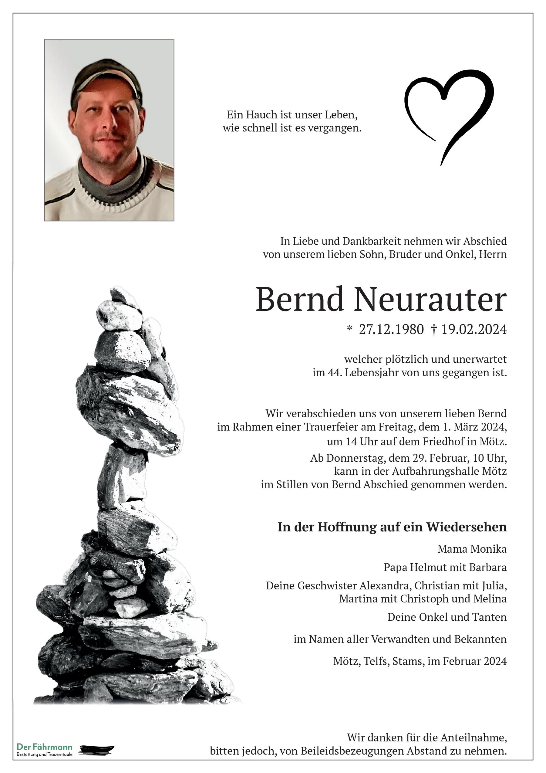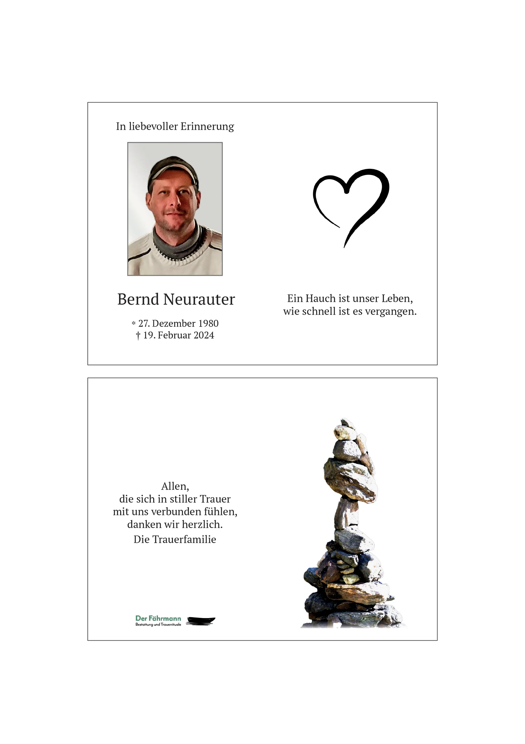der Verlust Ihres lieben Sohnes und Bruders Bernd durch seinen plötzlichen Tod ist so unfassbar traurig und ich möchte Ihnen mein tiefstes Mitgefühl u.herzliches Beileid aussprechen.