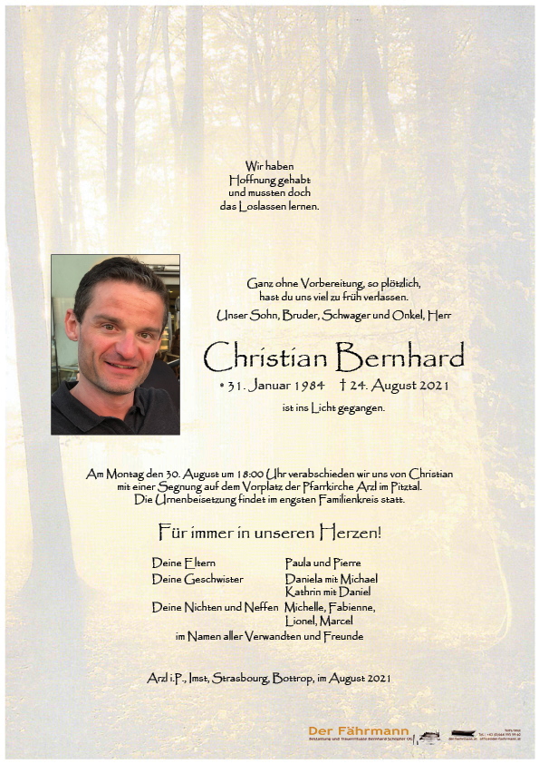 wir möchten euch unser herzlichstes Beileid aussprechen! Wir wünschen euch viel Kraft und Zuversicht und dass euch eure liebsten Erinnerungen an Christian durch diese sehr schwere Zeit tragen können!