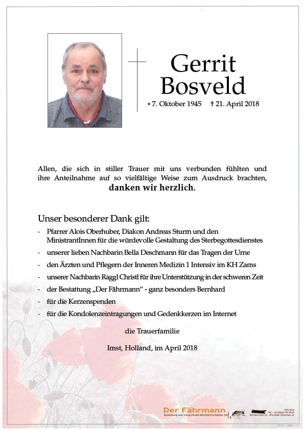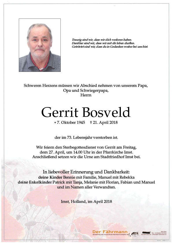 Der Kreis des Lebens hat sich geschlossen. Das Leben hat er stets genossen. So soll nun auch das Sterben sein, Opa, du bist nicht allein. Auf diesem letzten Weg, werden wir alle bei dir sein. Bilder verblassen mit der Zeit, doch die Erinnerung an dich, die bleibt.