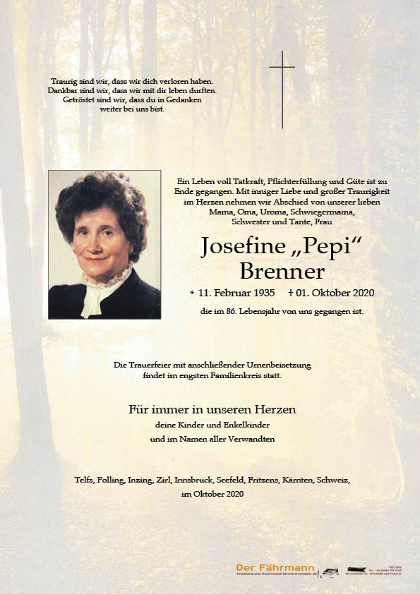 Brenner Josefine 11.02.1935 01.10.2020 Telfs Beisetzungs-Ort: Pfarrfriedhof Telfs Parte Gedenkkerzen Kondolenzen Parte downloaden Gedenkkerzen für Brenner Josefine 18 Einträge Kerze anzünden Waltraud-AWH.Wäscherei Ruhe in Frieden Helga und Claudia mit Familien Gute Reise Erika Brenner In stillem Gedenken Nicole Hanser mit Familie In stillem Gedenken Silvia, Matthias und Sarah In stillem Gedenken Tamsin und Claire Ruhe in Frieden Luis und Lore Denifle Ruhe in Frieden Luis und Lore Denifle Ruhe in Frieden Sigrid und Harald mit Familie AWH Telfs - Pflege Mitte In stillem Gedenken Fam. Sylvia und Thomas Reiner Edith Haßlwanter_Stams In Liebe R. I.P. Pflegerin Sonja Gute Reise Rosmarie mit Fam. Reiner Andreas Ruhe in Frieden Melli mit Familie eine gute Überfahrt Bestattung DER FÄHRMANN Eine Kerze für Brenner Josefine Ihr Name* Ihre Nachricht oder Name* E-Mail-Adresse* Mit dem Klicken auf "Kerze anzünden" erklären Sie sich mit unseren Datenschutzbestimmungen einverstanden. Kondolenzbuch für Brenner Josefine 0 Einträge Kondolenz verfassen Ihr Abschiedsgruß an Brenner Josefine Ihr Name* E-Mail-Adresse* Ihre Nachricht* Mit dem Klicken auf "Gruß absenden" erklären Sie sich mit unseren Datenschutzbestimmungen einverstanden. Brenner Josefine 11.02.1935 – 01.10.2020 Parte Gedenkkerzen Kondolenzen Kerze anzünden Kondolenz verfassen