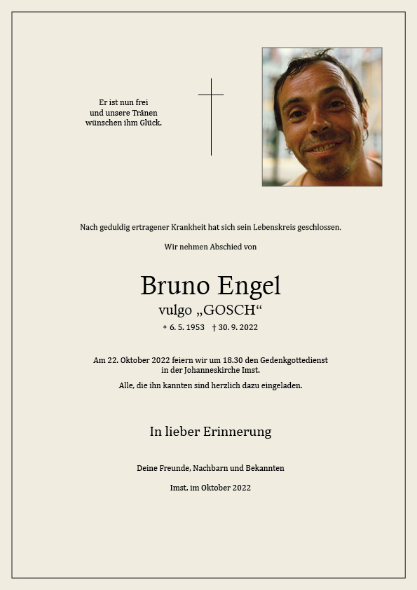 Lieber Bruno, ich werde dich und unsere Gespräche in lieber Erinnerung behalten! Gute Reise und Ruhe in Frieden,