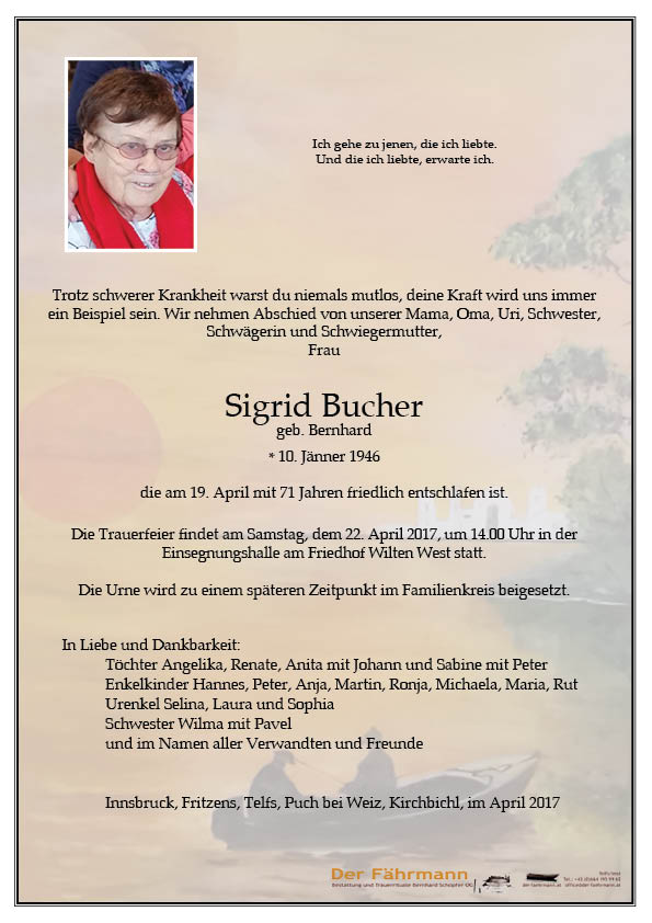 Bucher Sigrid 10.01.1946 19.04.2017 Innsbruck Beisetzungs-Ort: Friedhof Wilten-West Parte Gedenkkerzen Kondolenzen Parte downloaden Gedenkkerzen für Bucher Sigrid 17 Einträge Kerze anzünden Ruhe in Frieden Wolfgang Köck A Lichtle aus Arzl Pitztal A Lichtle für Deine Reise Erika Ruhe in Frieden Ruhe in Frieden Julia Ruhe in Frieden Kathrin Strassr hans jäger telfs Brigitte und Wolfi Metz Maria u. Erich Tschurtschenthaler Köll Gertraud Ruhe in Frieden! Steffi Ein Licht für deine Reise Heidi und Frido Arzl/Pitztal eine gute Überfahrt – Bestattung DER FÄHRMANN Eine Kerze für Bucher Sigrid Ihr Name* Ihre Nachricht oder Name* E-Mail-Adresse* Mit dem Klicken auf "Kerze anzünden" erklären Sie sich mit unseren Datenschutzbestimmungen einverstanden. Kondolenzbuch für Bucher Sigrid 1 Eintrag Kondolenz verfassen gUTE REISE LIEBE SIGRID AUF EINER ANDEREN EBENE WIR BETEN FÜR DICH;DEINE ALTEN FREUNDE AUS PACENGO HANS UND EDDA MIT BENJAMIN AUS BRIXLEGG EDDA BINDHAMMER 23.04.2017 | 08:48 Uhr Ihr Abschiedsgruß an Bucher Sigrid Ihr Name* E-Mail-Adresse* Ihre Nachricht* Mit dem Klicken auf "Gruß absenden" erklären Sie sich mit unseren Datenschutzbestimmungen einverstanden. Bucher Sigrid 10.01.1946 – 19.04.2017 Parte Gedenkkerzen Kondolenzen Kerze anzünden Kondolenz verfassen