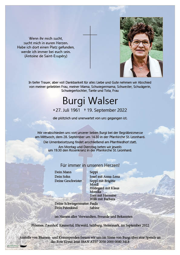 Liebe Burgi In unserem Leben hast du deinen Platz verlassen, in unseren Herzen bist du immer bei uns, in liebe und alle die dich liebten, dir nahestanden und dich nie vergessen werden.