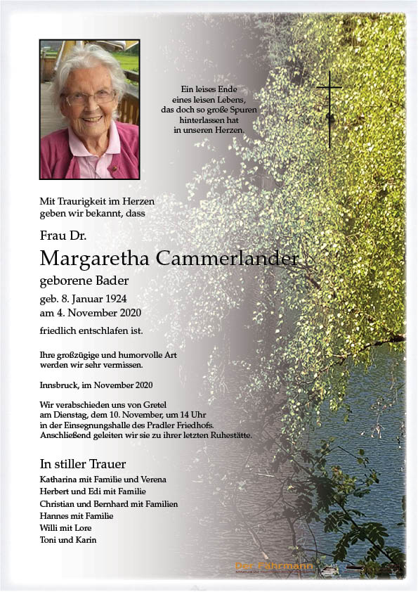 Cammerlander Margaretha 08.01.1924 04.11.2020 Innsbruck Beisetzungs-Ort: Pradler Friedhof Parte Gedenkkerzen Kondolenzen Parte downloaden Gedenkkerzen für Cammerlander Margaretha 11 Einträge Kerze anzünden In Erinnerung Fam. Pesendorfer Rosmarie Acherer Fam. Geiger aus Reutte Ruhe in Frieden Ruh in Frieden in liebevoller Erinnerung Lore und Willi Ruhe in Frieden Annemarie Vögele mit Familie In lieber und dankbarer Erinnerung Hannes und Katrin In stillem Gedenken Michaela und Bernhard 🦋 eine gute Überfahrt Bestattung DER FÄHRMANN Eine Kerze für Cammerlander Margaretha Ihr Name* Ihre Nachricht oder Name* E-Mail-Adresse* Mit dem Klicken auf "Kerze anzünden" erklären Sie sich mit unseren Datenschutzbestimmungen einverstanden. Kondolenzbuch für Cammerlander Margaretha 0 Einträge Kondolenz verfassen Ihr Abschiedsgruß an Cammerlander Margaretha Ihr Name* E-Mail-Adresse* Ihre Nachricht* Mit dem Klicken auf "Gruß absenden" erklären Sie sich mit unseren Datenschutzbestimmungen einverstanden. Cammerlander Margaretha 08.01.1924 – 04.11.2020 Parte Gedenkkerzen Kondolenzen Kerze anzünden Kondolenz verfassen