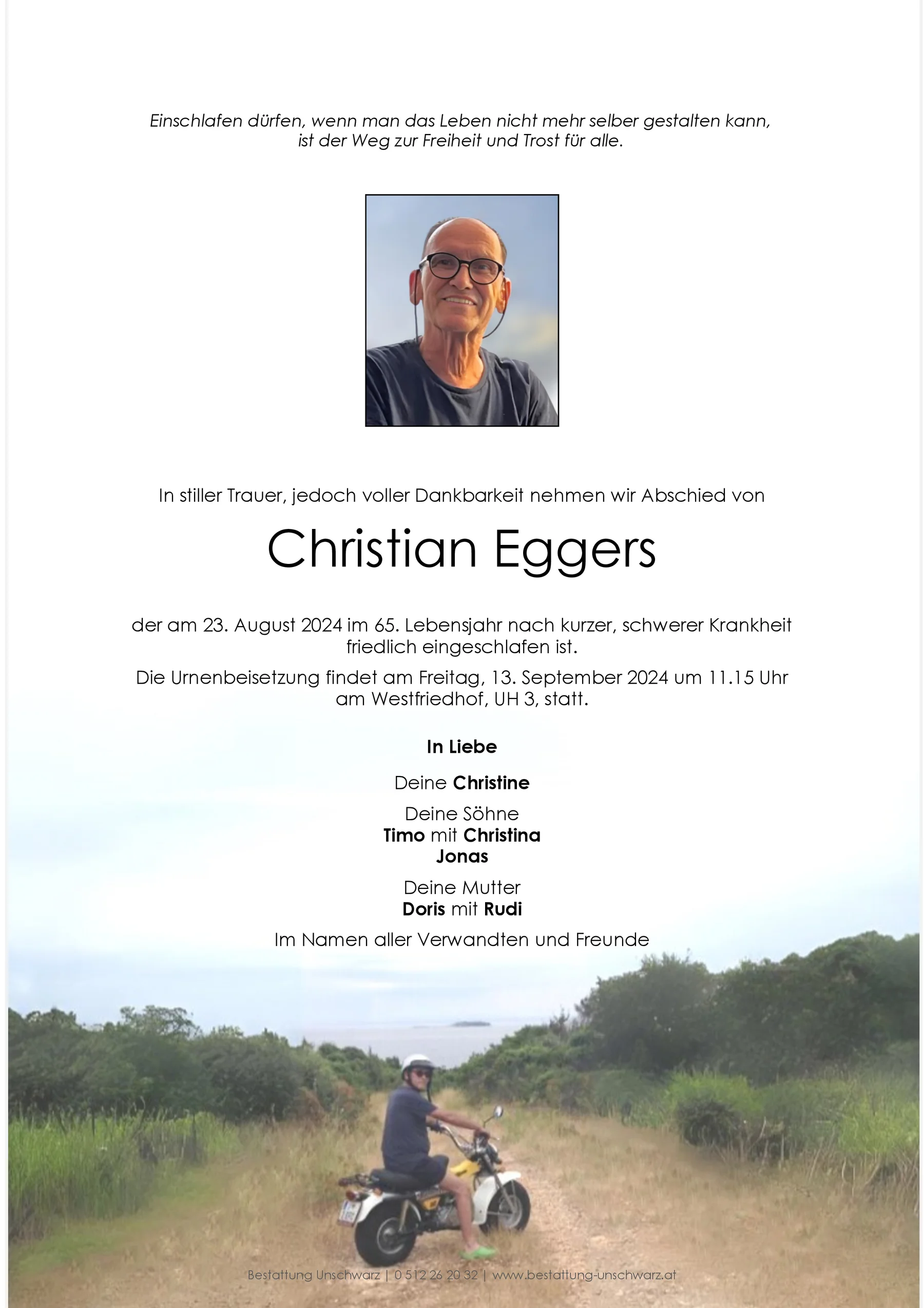 Christian Eggers 25.12.1959 23.08.2024 Innsbruck Trauerfeier, Westfriedhof UH3 13.09.2024, 11:15 Uhr Route Beisetzungs-Ort: Westfriedhof Parte Gedenkkerzen Kondolenzen Parte downloaden Gedenkkerzen für Christian Eggers 13 Einträge Kerze anzünden Ruhe in Frieden Ulli und Bertl, Moritz, Felix Schett RIP Barbara, Helli und Kathrin In stillem Gedenken Margret, Hansjörg, Hanna u. Lukas Barbara Sock-Bramböck Petra Triendl Machs guat! In stillem Gedenken! Deine Kolleginnen Rafaela, Kristin, Erika, Bettina Doris Schumacher Lisa & Lorenz mit Johannes und Valentina A Liachtle für di RIP - Ulli und Konrad Eine gute Überfahrt wünscht Bestattung "Der Fährmann" Eine Kerze für Christian Eggers Ihr Name* Ihre Nachricht oder Name* E-Mail-Adresse* Mit dem Klicken auf "Kerze anzünden" erklären Sie sich mit unseren Datenschutzbestimmungen einverstanden. Kondolenzbuch für Christian Eggers 0 Einträge Kondolenz verfassen Ihr Abschiedsgruß an Christian Eggers Ihr Name* E-Mail-Adresse* Ihre Nachricht* Mit dem Klicken auf "Gruß absenden" erklären Sie sich mit unseren Datenschutzbestimmungen einverstanden. Christian Eggers 25.12.1959 – 23.08.2024 Parte Gedenkkerzen Kondolenzen Kerze anzünden Kondolenz verfassen