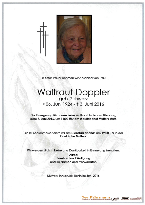 Doppler Waltraut 06.06.1924 03.06.2016 Mutters Beisetzungs-Ort: Waldfriedhof Mutters Parte Gedenkkerzen Kondolenzen Parte downloaden Gedenkkerzen für Doppler Waltraut 17 Einträge Kerze anzünden Ruhe in Frieden Wolfgang Köck Waltraut, who embodied the joy of existential reading Eberhard und Christl Sauermann Johannes John Walter Hettche Heike Ortner In stiller Anteilnahme. Ferdl Andrea und Thomas Rainer Wolfgang und Johanna Helmuth Tartarotti Anton und Gaby Sieglinde Klettenhammer Wolfgang und Angelika Ulrike Tanzer Monika und Michael Klein Wolfgang und Elisabeth Wiesmüller Eine Kerze für Doppler Waltraut Ihr Name* Ihre Nachricht oder Name* E-Mail-Adresse* Mit dem Klicken auf "Kerze anzünden" erklären Sie sich mit unseren Datenschutzbestimmungen einverstanden. Kondolenzbuch für Doppler Waltraut 0 Einträge Kondolenz verfassen Ihr Abschiedsgruß an Doppler Waltraut Ihr Name* E-Mail-Adresse* Ihre Nachricht* Mit dem Klicken auf "Gruß absenden" erklären Sie sich mit unseren Datenschutzbestimmungen einverstanden. Doppler Waltraut 06.06.1924 – 03.06.2016 Parte Gedenkkerzen Kondolenzen Kerze anzünden Kondolenz verfassen