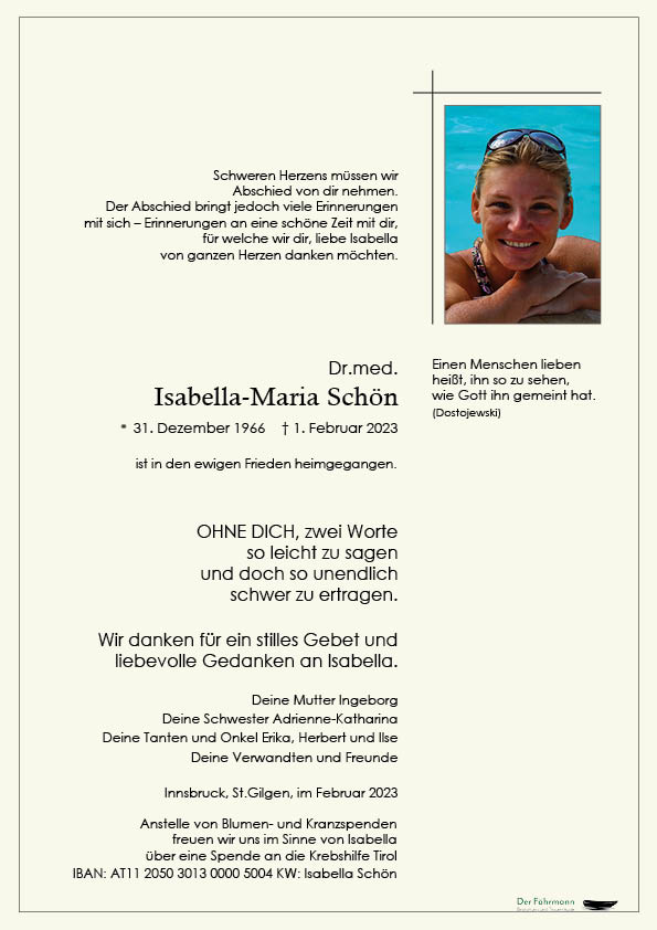 Frau Dr Isabella Schön war eine besondere Ärztin und ich fühlte mich, während meiner Kuraufenthalte, von ihr sehr gut betreut. Diese traurige Nachricht, die ich erst heute - 12.10.2023 - erhielt, berührt mich sehr. Mein aufrichtiges Beileid und tiefes Mitempfinden!