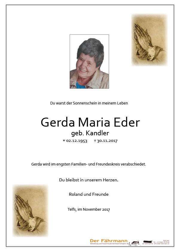 Eder Gerda 02.12.1953 30.11.2017 Telfs Beisetzungs-Ort: Friedhof St. Martin in Schwaz Parte Gedenkkerzen Kondolenzen Parte downloaden Gedenkkerzen für Eder Gerda 15 Einträge Kerze anzünden Wolfgang Köck Ruhe in Frieden In Erinnerung Peter und Anni in stiller Erinnerung Nairz Franz Telfs Fam. Ekkehart und Margit Tögel Arnold Wackerle INGRID UND JOSEF A Kerzl aus Innsbruck Gerhard & Lisi Ruhe in Frieden! Viel Kraft für Roli. Marina und Hannes Ein Licht für deine Reise! Mima Ruhe in Frieden. Hubert Neururer / Telfs eine gute Überfahrt Bestattung DER FÄHRMANN Eine Kerze für Eder Gerda Ihr Name* Ihre Nachricht oder Name* E-Mail-Adresse* Mit dem Klicken auf "Kerze anzünden" erklären Sie sich mit unseren Datenschutzbestimmungen einverstanden. Kondolenzbuch für Eder Gerda 0 Einträge Kondolenz verfassen Ihr Abschiedsgruß an Eder Gerda Ihr Name* E-Mail-Adresse* Ihre Nachricht* Mit dem Klicken auf "Gruß absenden" erklären Sie sich mit unseren Datenschutzbestimmungen einverstanden. Eder Gerda 02.12.1953 – 30.11.2017 Parte Gedenkkerzen Kondolenzen Kerze anzünden Kondolenz verfassen
