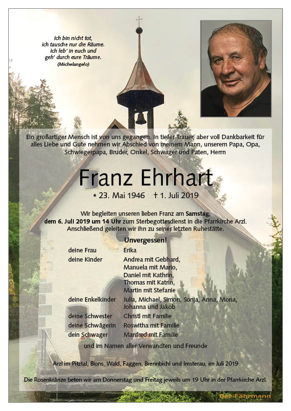 Wir haben gebetet und gehofft, dass Franz auch dieses Mal wieder gesund nach Hause kommt. Leider sollte es nicht sein. Er hat sein ganzes Leben lang nur das Beste gegeben. Wir sind stolz, dass wir mit Franz viele Jahre in Freundschaft leben durften. Bei vielen familiären Treffen hat die Großfamilie Franz respektiert, seinen Humor und herzliche Liebe hat jeder gerne genossen.
