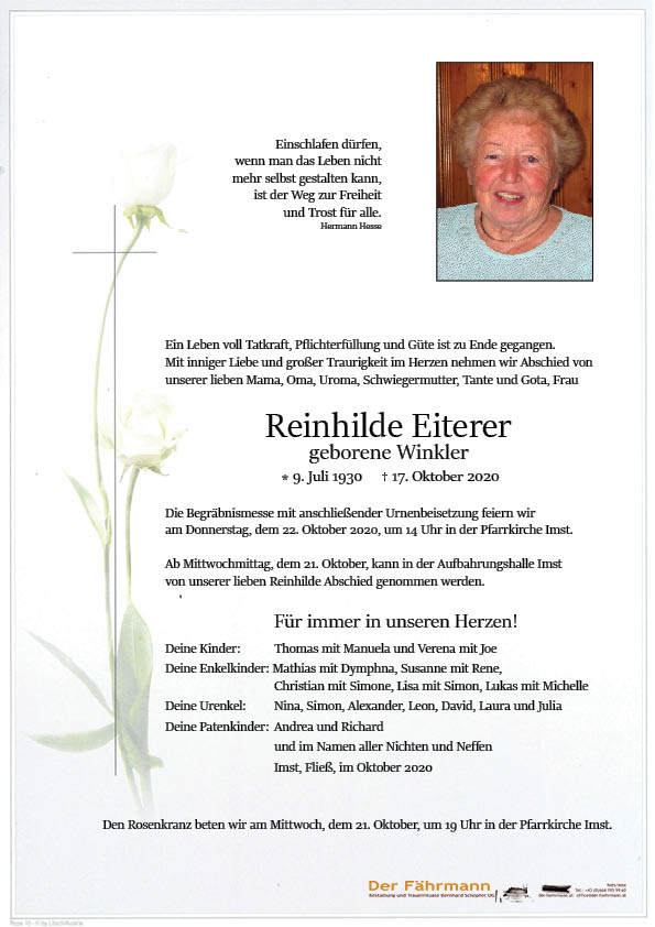 Liebe Reinhilde, viel Liachtln sollen dich auf dem letzten Weg zum Himmel, den du sicher verdient hast, begleiten.