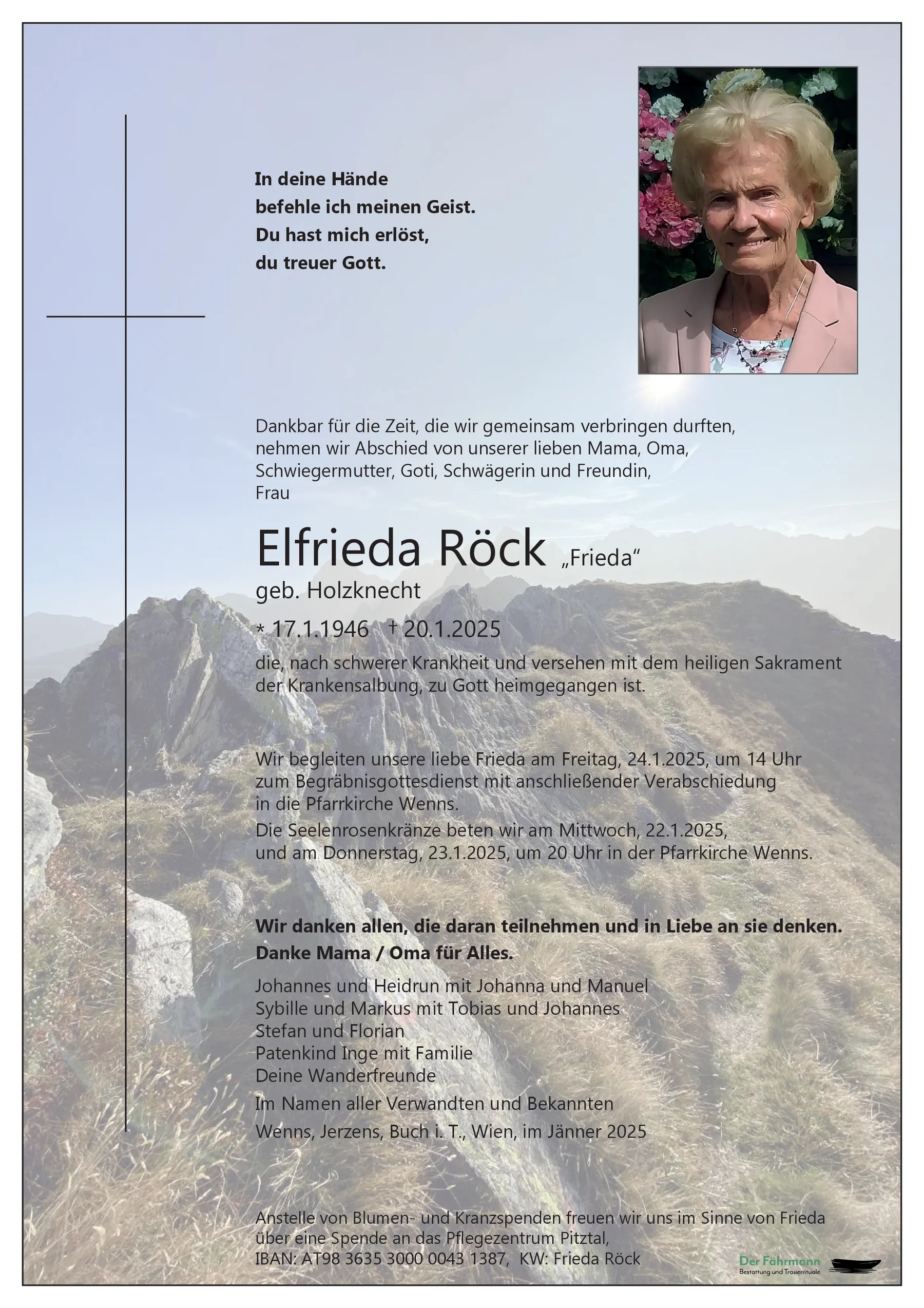 Liebe Frieda, wir danke dir für deine ruhige und ausgleichende Art. Mit dir hat ein weiteres Mitglied unserer Wandergruppe seine letzte Reise angetreten, du wirst in unserer Mitte fehlen.