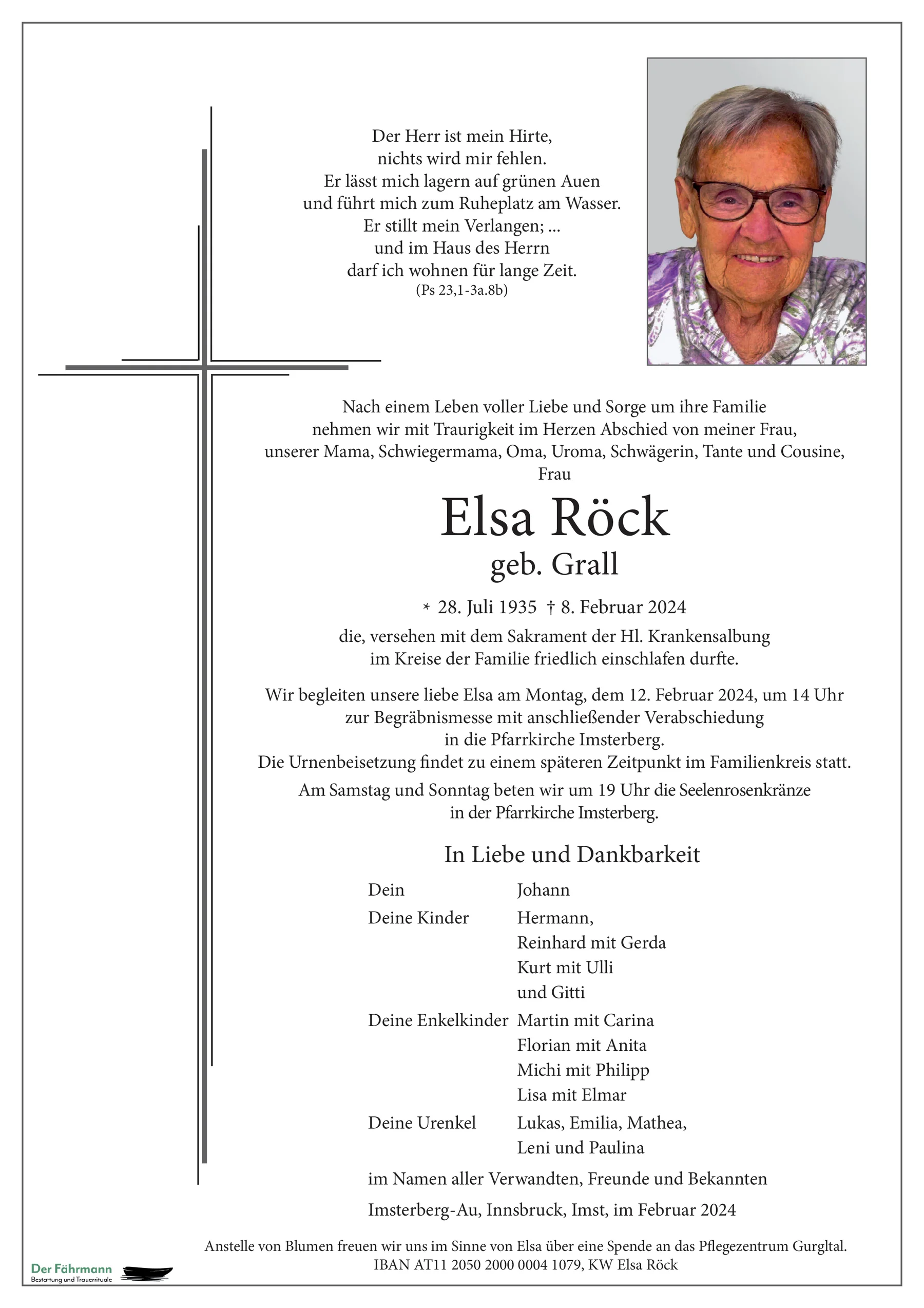Mein aufrichtigstes Beileid zum Heimgang eurer lieben Elsa, die für so manchen ein Vorbild an Mensch war. Bescheiden, zufrieden und freundlich. Viel Kraft euch allen.