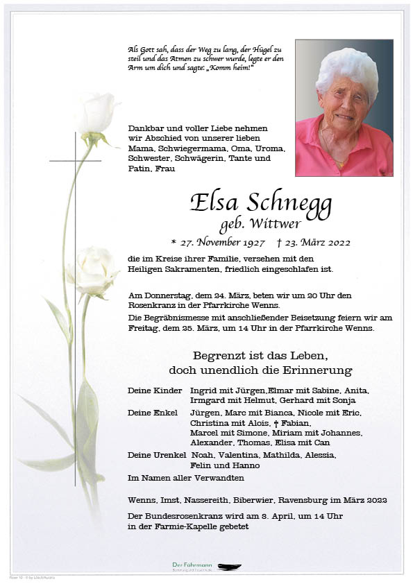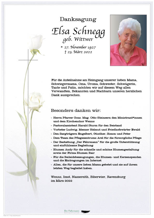 Zum Heimgang eurer Mutter spreche ich euch mein tiefstes Mitgefühl aus, aber das schönste was man haben kann sind die Erinnerungen an eurer Mutter Elsa.