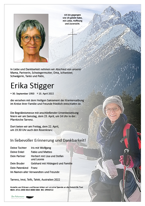 Der Herr gebe Dir die Kraft, den Schmerz zu überwinden und hoffe, dass Dich Deine liebe Mutter beschützt. Auch Ich musste meine liebe Mutter dem Himmel übergeben. Ein trost, die Erika hat keinerlei Schmerzen mehr zu tragen.Gott soll Sie beschützen. Sie war eine wunderbare Frau und immer lustig trotz Krankheit. Auch wir vermissen deine liebe Mutter.