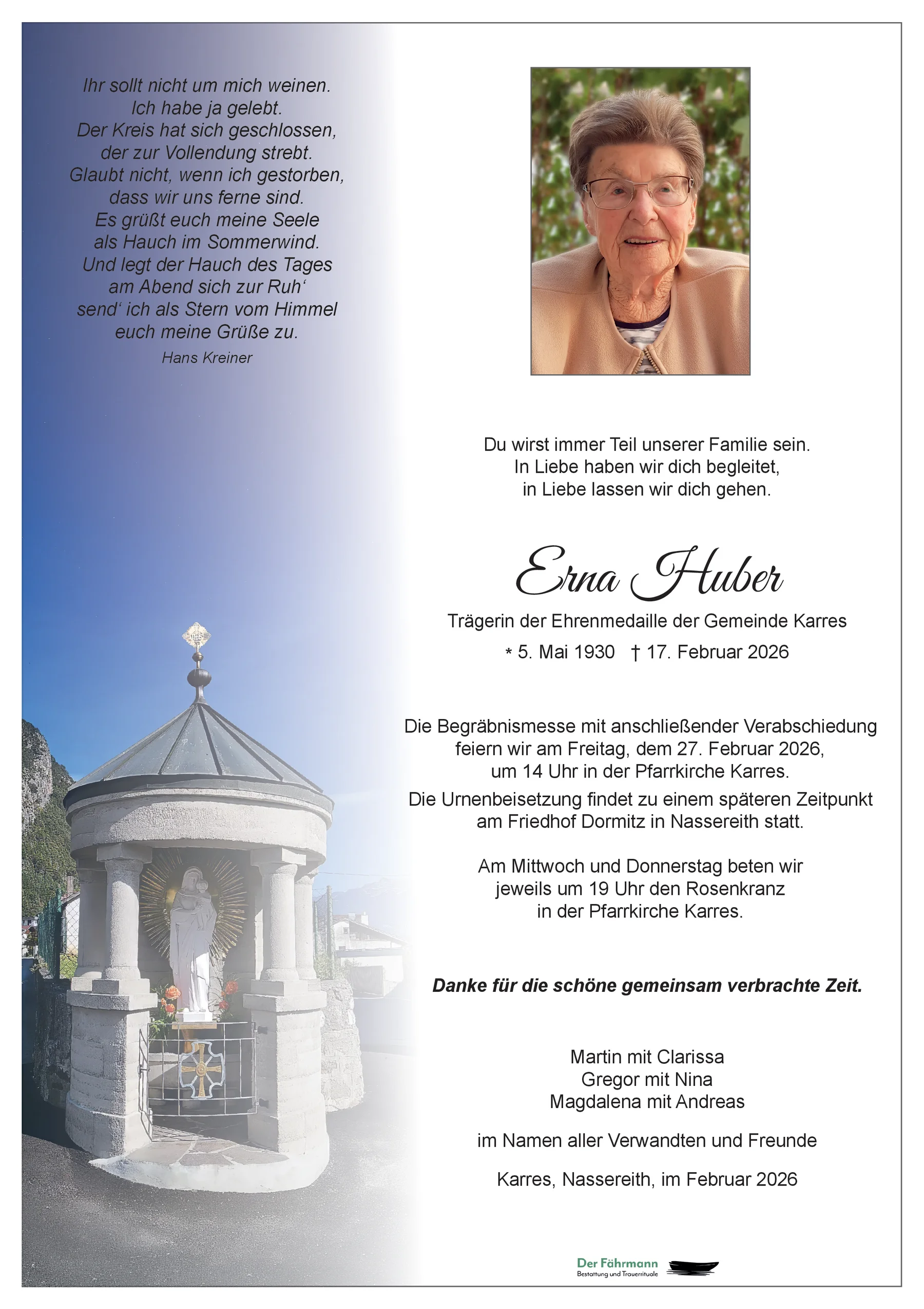 Wir sind sehr dankbar, dass wir Erna so lange auf ihrem Lebensweg begleiten durften und werden ihr freundliches Wesen und ihre Sprüche in liebevoller Erinnerung behalten.