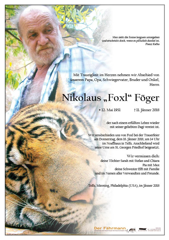 Ihr musstet sehr früh Abschied von Dagi nehmen und nun auch von Foxl. Was uns allen bleibt ist die Erinnerung an Eure netten und kreativen Eltern und diese Erinnerung tragen wir in unseren Herzen. Wir wünschen Euch mit Euren Partnern und Kinder viel Kraft in dieser traurigen Zeit.