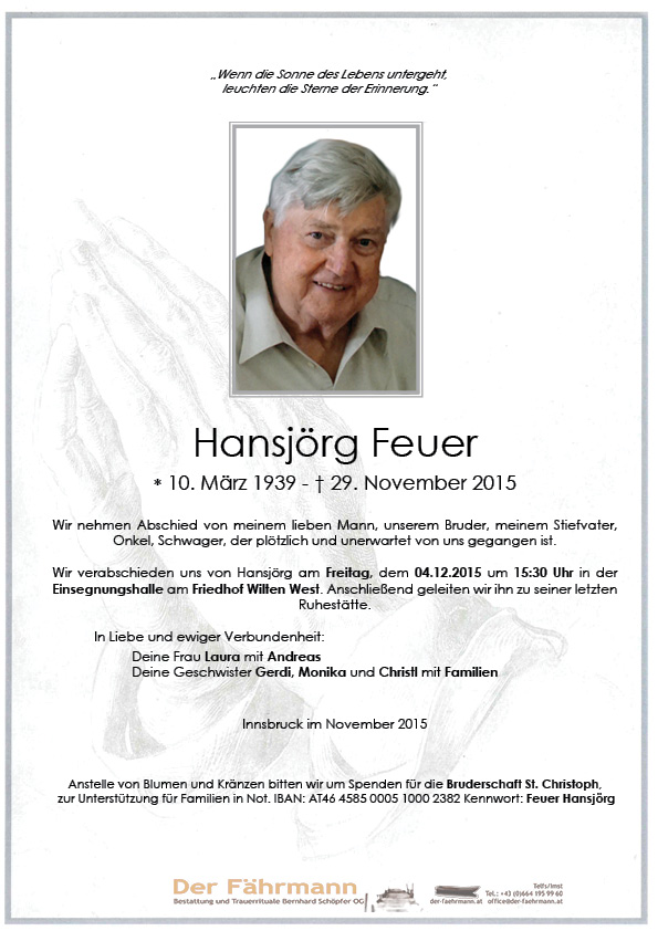 Feuer Hansjörg 10.03.1939 29.11.2015 Innsbruck Beisetzungs-Ort: Friedhof Wilten West Parte Gedenkkerzen Kondolenzen Parte downloaden Gedenkkerzen für Feuer Hansjörg 5 Einträge Kerze anzünden Aufrichtige Anteilname Peter mit Hannelore Walter Stadtapotheke Winkler Walter Pramstaller ferdinand hatzl Eine Kerze für Feuer Hansjörg Ihr Name* Ihre Nachricht oder Name* E-Mail-Adresse* Mit dem Klicken auf "Kerze anzünden" erklären Sie sich mit unseren Datenschutzbestimmungen einverstanden. Kondolenzbuch für Feuer Hansjörg 0 Einträge Kondolenz verfassen Ihr Abschiedsgruß an Feuer Hansjörg Ihr Name* E-Mail-Adresse* Ihre Nachricht* Mit dem Klicken auf "Gruß absenden" erklären Sie sich mit unseren Datenschutzbestimmungen einverstanden. Feuer Hansjörg 10.03.1939 – 29.11.2015 Parte Gedenkkerzen Kondolenzen Kerze anzünden Kondolenz verfassen