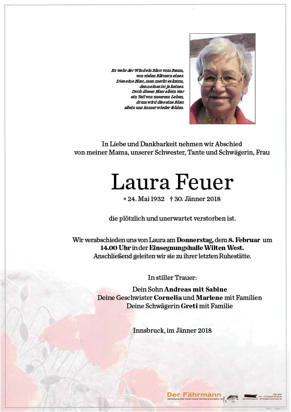 Feuer Laura 24.05.1932 30.01.2018 Innsbruck Beisetzungs-Ort: Friedhof Wilten West Parte Gedenkkerzen Kondolenzen Parte downloaden Gedenkkerzen für Feuer Laura 7 Einträge Kerze anzünden Ruhe in Frieden Ruhe in Frieden Wolfgang Köck Ruhe in Freude und Frieden Gute Reise. Barbara, Nadja und Silvia Inge Huber und Familie eine gute Überfahrt Bestattung DER FÄHRMANN Eine Kerze für Feuer Laura Ihr Name* Ihre Nachricht oder Name* E-Mail-Adresse* Mit dem Klicken auf "Kerze anzünden" erklären Sie sich mit unseren Datenschutzbestimmungen einverstanden. Kondolenzbuch für Feuer Laura 0 Einträge Kondolenz verfassen Ihr Abschiedsgruß an Feuer Laura Ihr Name* E-Mail-Adresse* Ihre Nachricht* Mit dem Klicken auf "Gruß absenden" erklären Sie sich mit unseren Datenschutzbestimmungen einverstanden. Feuer Laura 24.05.1932 – 30.01.2018 Parte Gedenkkerzen Kondolenzen Kerze anzünden Kondolenz verfassen