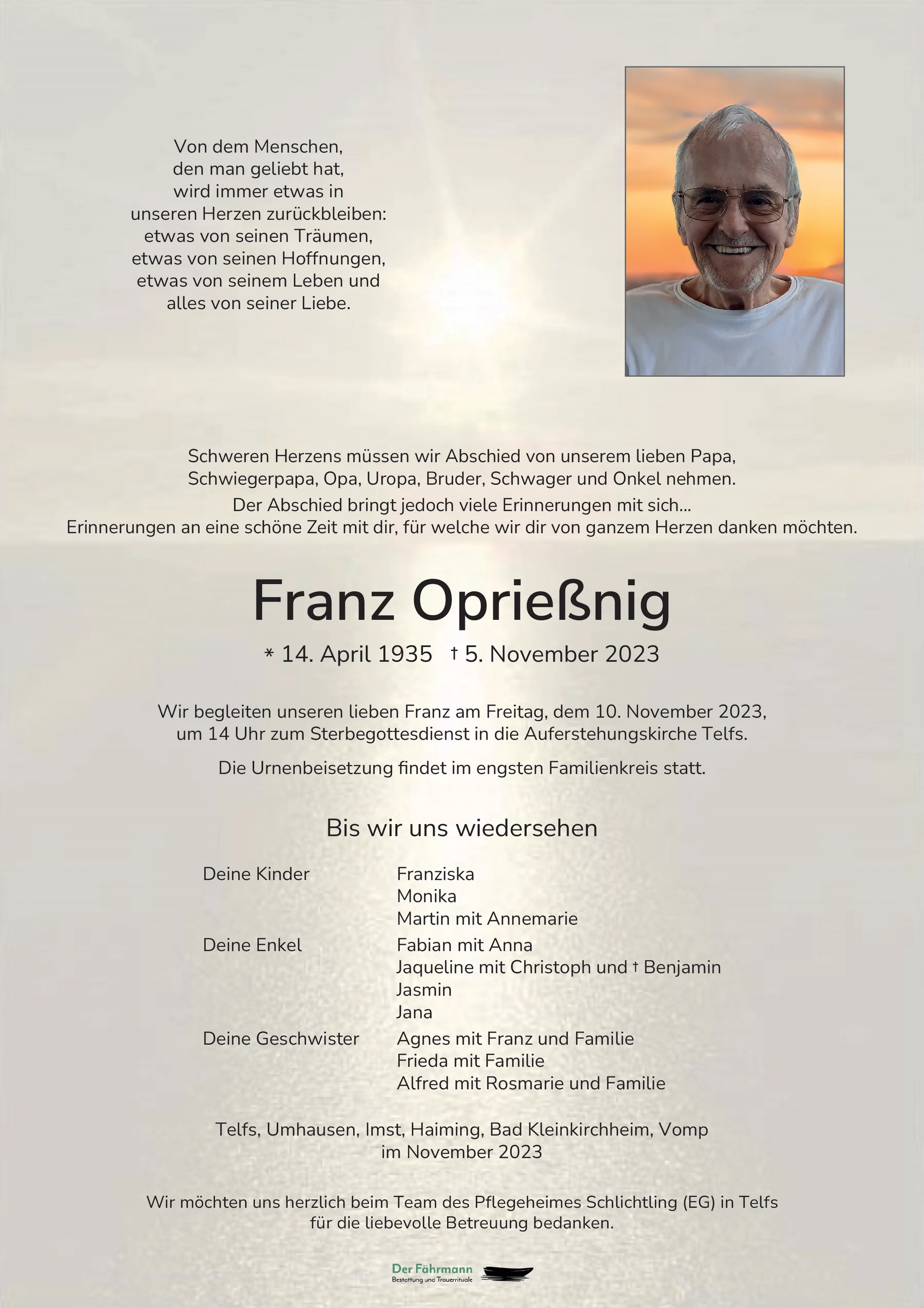 Lieber Martin, liebe Angehörige. Immer wenn ich im Altersheim zu Besuch war habe ich ein paar Worte mit eurem Papa getauscht. Er war immer sehr lustig und für ein paar Scherze aufgelegt. Anbei darf ich euch mein herzliches Beileid zum Tod eures Papas entbieten. Ich wünsche euch allen viel Kraft und Mut das Geschehene zu verarbeiten. Evi