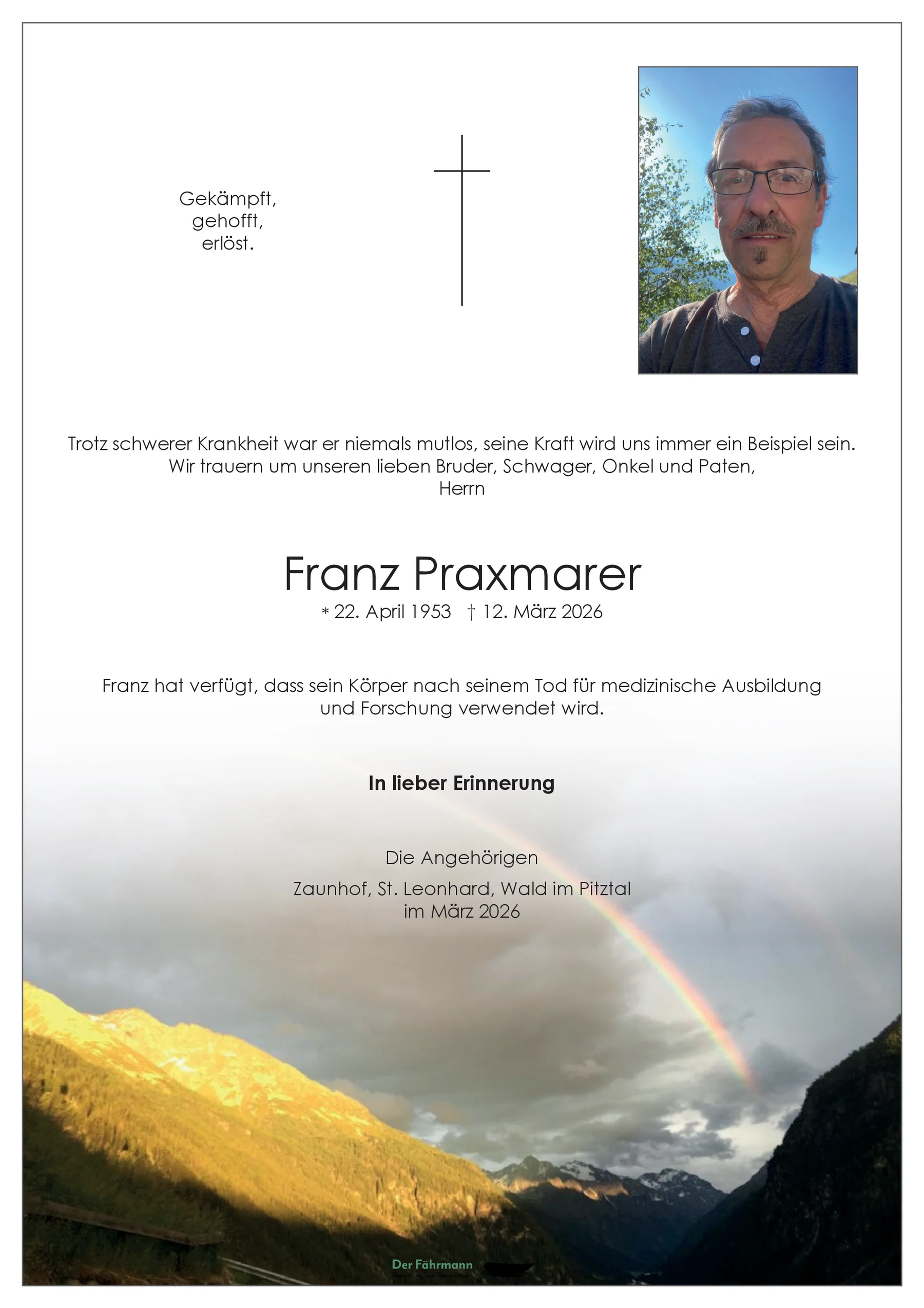 Ja lieber Franzl nun bist Du uns vorangegangen ,ich denke oft an die Zeit die wir zusammen verbracht haben früher, es schmerzt mich sehr Dich nie mehr sehen zu können aber in unser Allen Herzen lebst Du weiter, immer warst Du da wenn ich Hilfe gebraucht habe oder jemanden zum Reden eben. Ich glaube aber daran dass wir uns einmal wiedersehen, somit ein letzter voll Dankbarkeit erfüllter Gruss an DICH vom Tschenet Hansl RUHE IN FRIEDEN!!