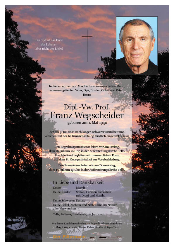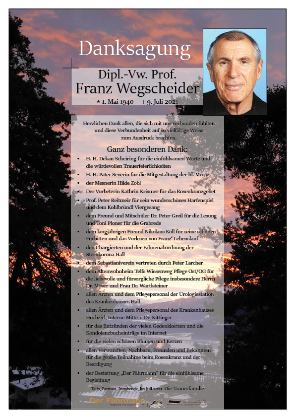 Wir möchten unser herzliches Beileid zum Ableben von Franz zum Ausdruck bringen. Ich hätte die Freude Franz als Handelsschulprofessor in den Jahren 1969 bis 1972 zu haben. Danke Dir Franz für diese schönen Jahre. Ruhe in Frieden.Christandl Günter mit Familie