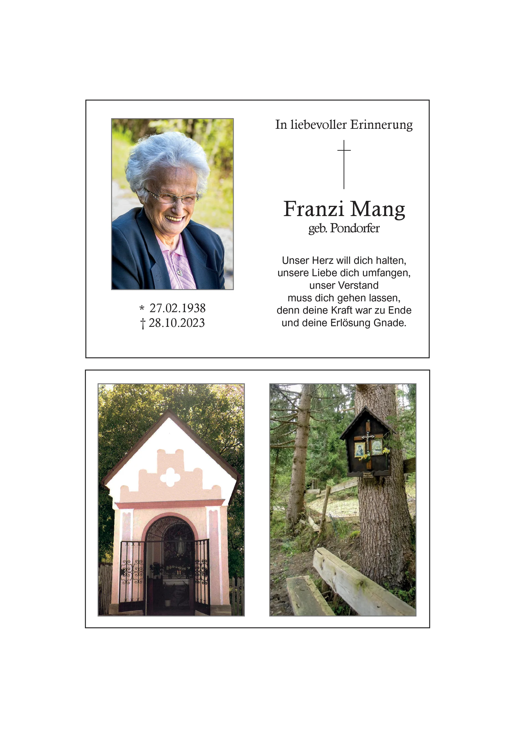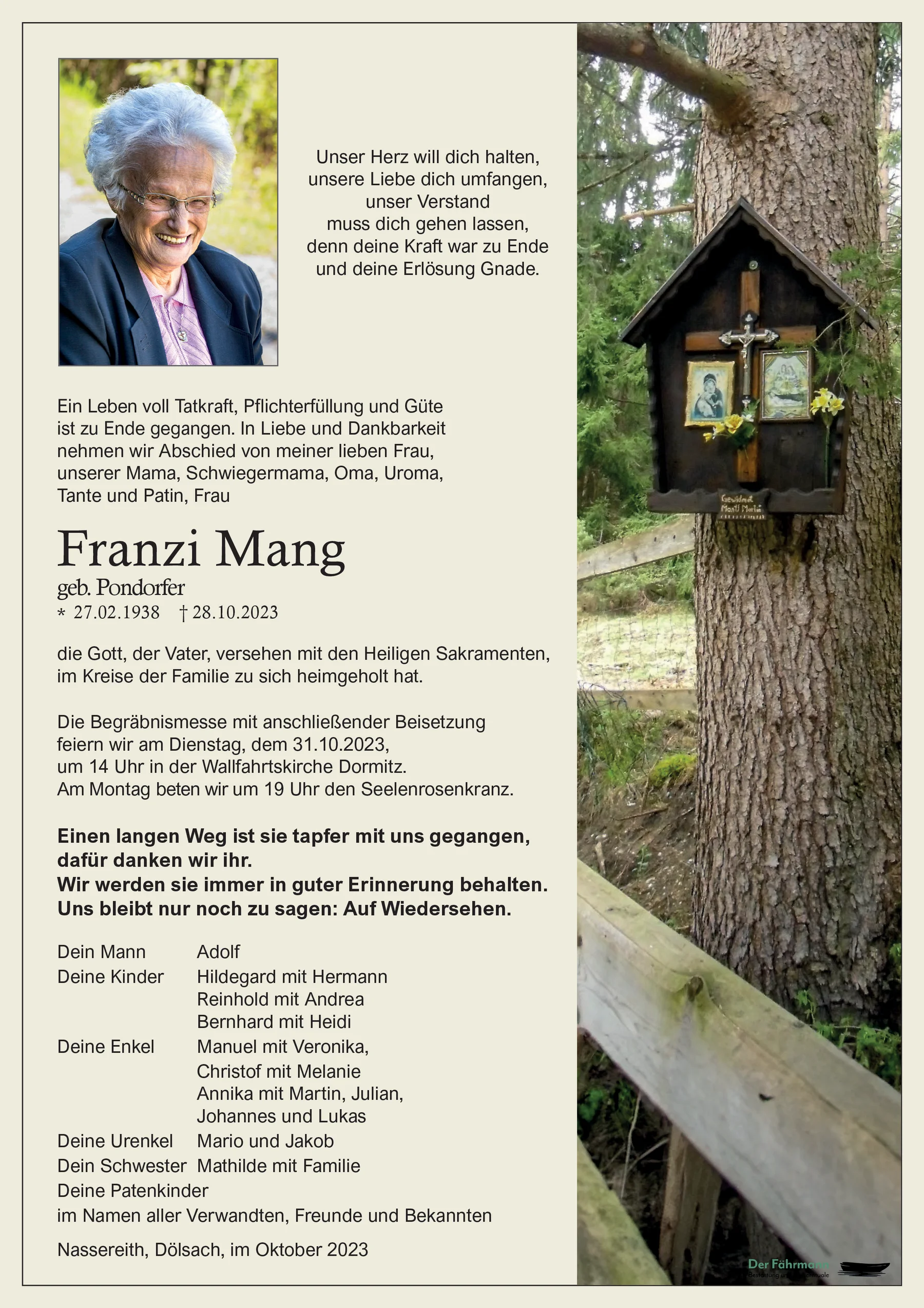 Wir wünschen Dir, lieber Adolf, und allen Angehörigen von Franzi viel Kraft und Zuspruch in der kommenden Zeit.