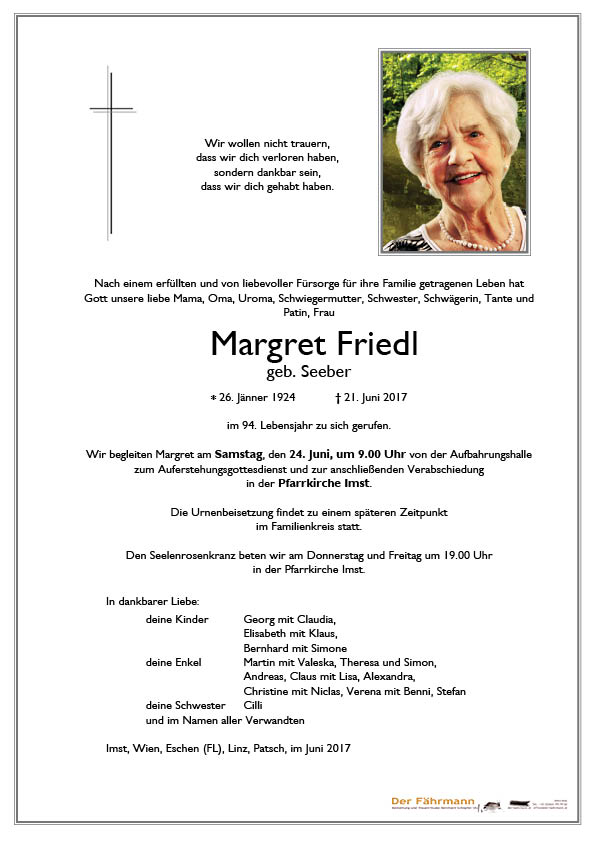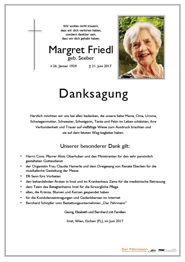 Ich bin dafür sehr dankbar und wünsche euch allen Kraft und Zuversicht in der Trauer und viele schöne Erinnerungen an die liebe Margret.