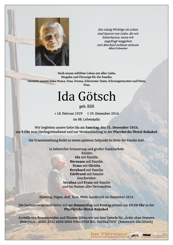 Herzliche Anteilnahme am Tod eurer Mama, Oma, Uroma und Schwiegermama und möge die Erinnerung Kraft und Stärke geben. Es ist schön, Ida besser gekannt zu haben und mir sind viele Begegnungen in guter Erinnerung und mit diesen Erinnerungen wird sie auch bei mir weiterleben.
